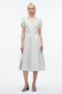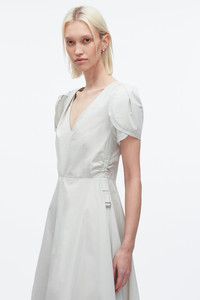 Sleek and sculptural, this dress is crafted from crisp technical poplin with a clean V-neckline and softly puffed sleeves. A gathered side strap cinches the waist, creating subtle volume and shape through the skirt. Finished with tonal binding and an asymmetrical hem, it brings quiet detail to a streamlined silhouette. Easy to style, effortless to wear. - 70% Cotton, 30% Polyester - Model is 5'10', Bust: 30', Waist: 23', Hips: 34' and wearing a size 4 - Professional dry clean only