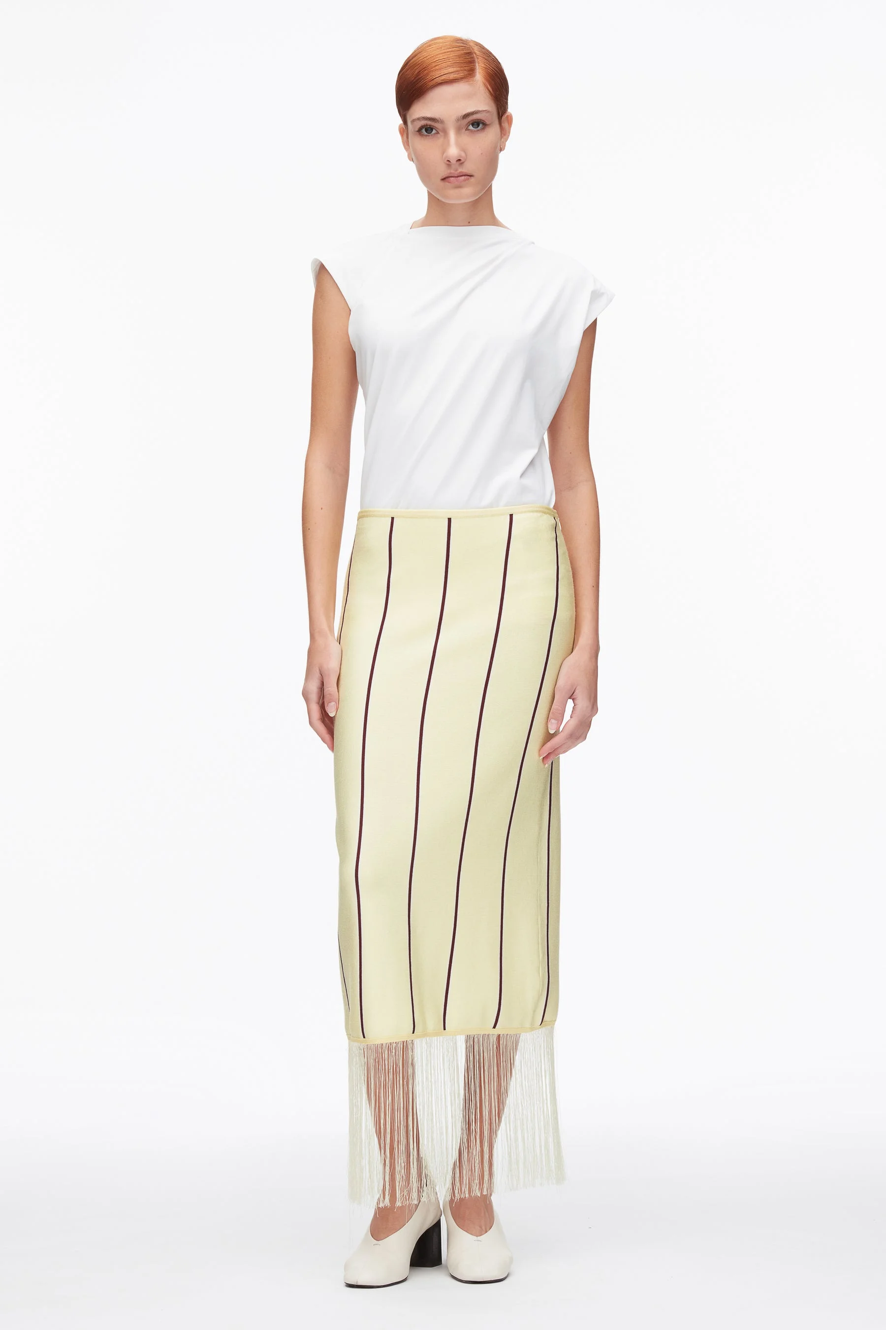 Sporty yet sensual, this midi skirt hugs the body before finishing with ankle-skimming fringe for fluid movement. A center-back slit feels effortless—and adds just the right amount of reveal. Confident and dynamic, it’s designed to move with you from day into night. - 100% Rayon - Model is 5'10', Bust: 30', Waist: 23', Hips: 34' and wearing a size 4 - Professional dry clean only