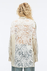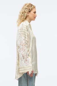 A classic button-down, redefined. This striped viscose shirt plays with contrast, balancing crisp tailoring with the delicacy of intricate lace. The structured front evokes timeless menswear, while sheer lace sleeves and a back panel bring an unexpected sensuality. A statement piece that remains endlessly wearable, it’s the perfect companion for summer in the city—light enough for the heat, polished enough for any occasion. Wear it with denim for effortless ease. - 100% Viscose - Model is 5'10', Bust: 30', Waist: 23', Hips: 34' and wearing a size 4 - Professional dry clean only