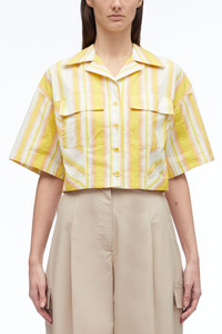 Cropped cotton shirt with a stripe pattern. Features a camp collar and short sleeves. Chest flap pockets. Button front closure. Relaxed fit. - Camp collar - Short sleeves - Chest flap pockets - Button front closure - Relaxed fit - Model Height: 5'10', Bust: 31', Waist: 23', Hips: 34' and wearing a size 2