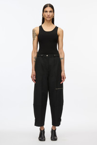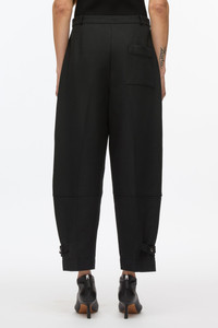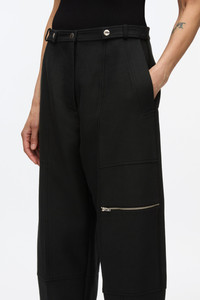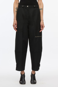 Subverting workwear codes, these pants are accented with utilitarian details and multiple pockets. Cut in Italian cotton wool twill, it has a clean and modern hand. Barrel shaped leg with a tapered opening, with adjustable tabs at cuff. Cropped length. - 70% Cotton, 21% Viscose, 9% Wool - Model is 5'10', Bust: 30', Waist: 23', Hips: 34' and wearing a size Small - Professional dry clean only