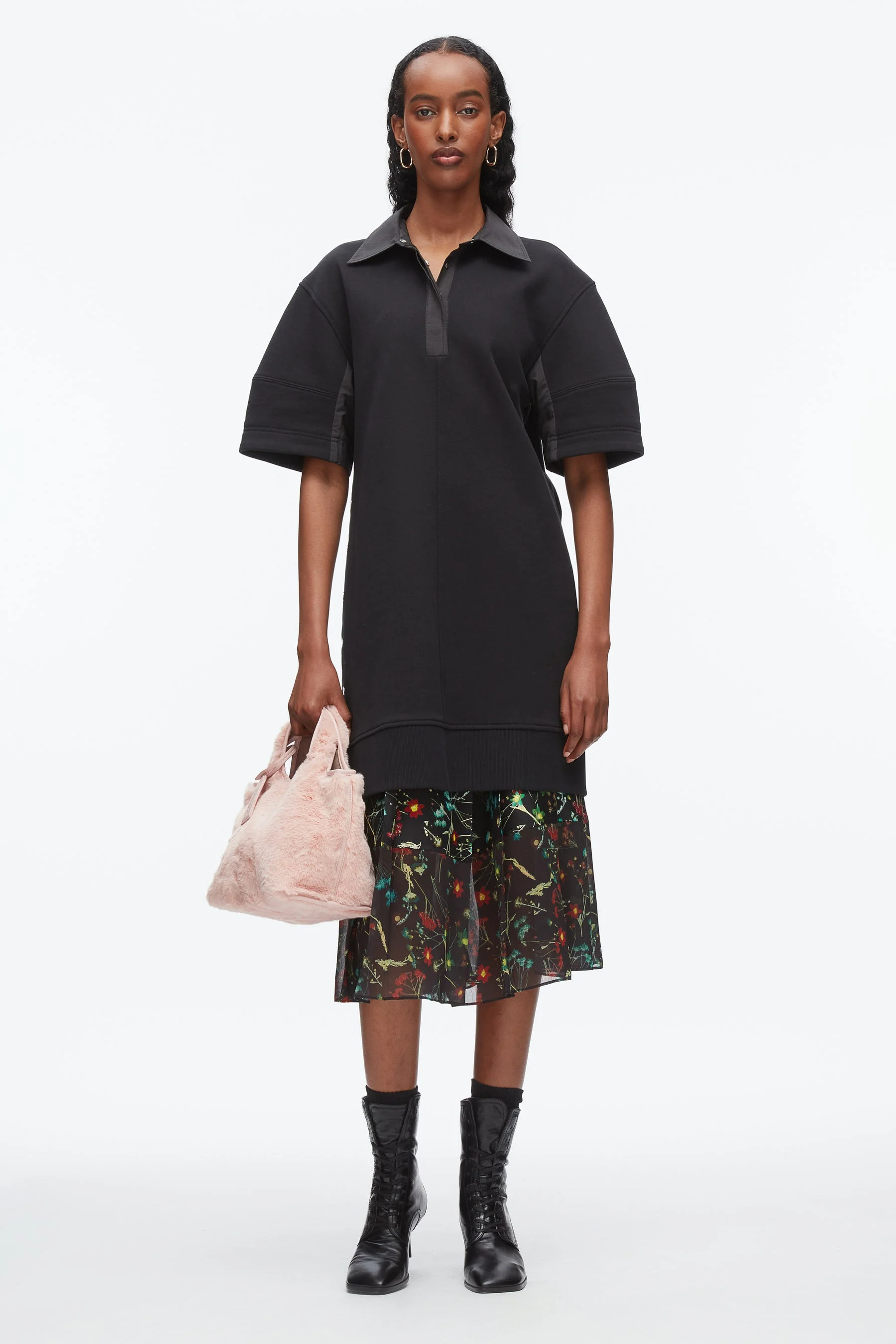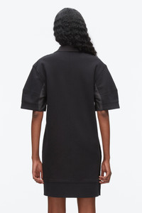 A cool-girl take on sporty minimalism—laid-back, unexpected, and effortlessly pulled together. This French terry polo dress features an exaggerated sleeve and nylon ripstop collar for a hit of utilitarian edge. Tonal trim details and side snap buttons offer adjustable styling, making it perfect worn solo or layered over a printed skirt for a modern, mixed-media look. - 100% Cotton - Model is 5'10', Bust: 30', Waist: 23', Hips: 34' and wearing a size 4 - Professional dry clean only"