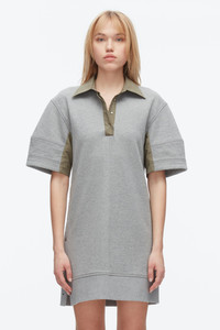 A cool-girl take on sporty minimalism—laid-back, unexpected, and effortlessly pulled together. This French terry polo dress features an exaggerated sleeve and nylon ripstop collar for a hit of utilitarian edge. Tonal trim details and side snap buttons offer adjustable styling, making it perfect worn solo or layered over a printed skirt for a modern, mixed-media look. - 100% Cotton - Model is 5'10', Bust: 30', Waist: 23', Hips: 34' and wearing a size 4 - Professional dry clean only"