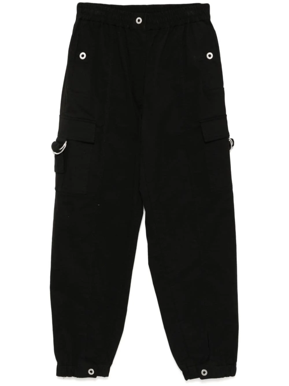 tapered leg trousers Highlights - Black - Front button and zip fastening - Elasticated waistband with internal drawstring - Two side button-fastening pockets - Two side flap pockets - Silver-tone hardware - Rear button-fastening pocket - Zip detail - Decorative button detailing - Tapered leg - Elasticated hem Imported Composition Body: Cotton 98%, Elastane 2%