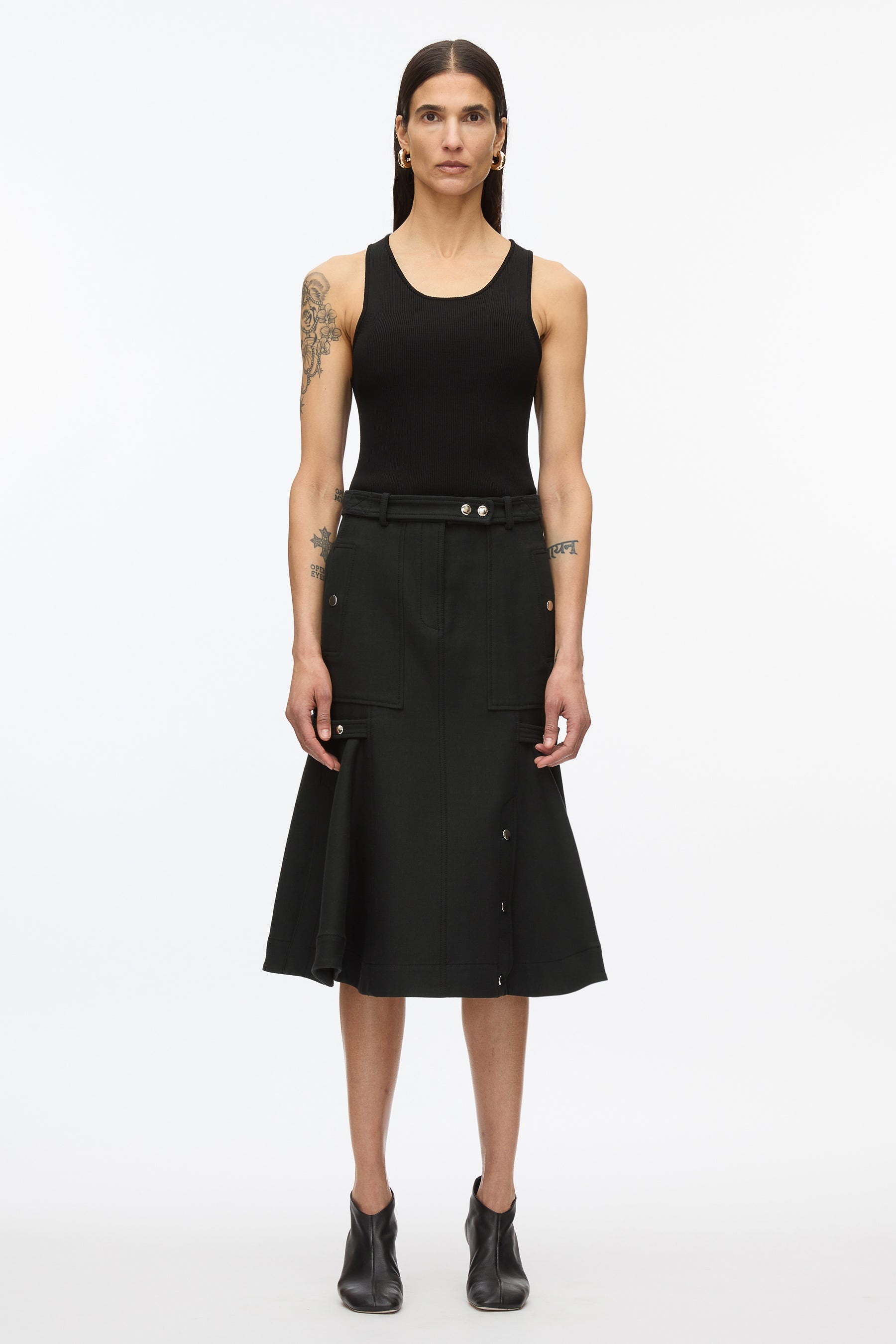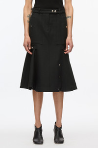 Inspired by the romantic toughness of our home, New York City, this cargo style skirt has godet panel to give it a flare silhouette. Rendered in Italian cotton wool twill, giving a clean modern look but soft to the touch. Accented with high polish snaps details. - 70% Cotton, 21% Viscose, 9% Wool - Model is 5'10', Bust: 30', Waist: 23', Hips: 34' and wearing a size Small - Professional dry clean only
