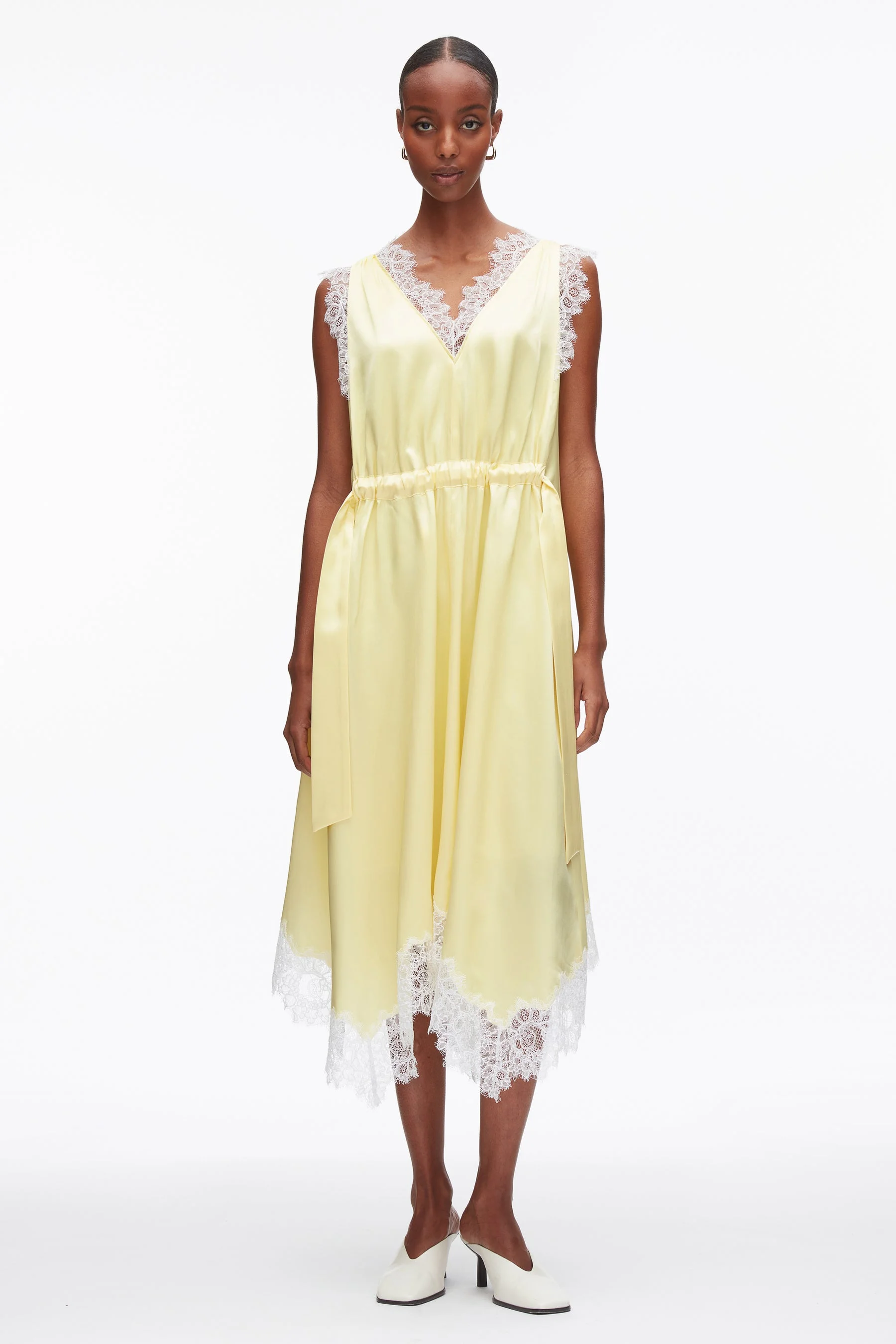 A statement dress with a romantic point of view. The lace-trimmed V-neck and cinched waist create gentle definition, balanced by a floaty skirt that falls to mid-calf. The handkerchief hem adds movement and texture—just as beautiful in motion as it is at rest. Style it simply and let the details do the work. - 100% Polyester - Model is 5'10', Bust: 30', Waist: 23', Hips: 34' and wearing a size 4 - Professional dry clean only