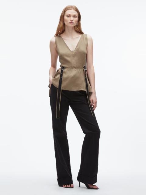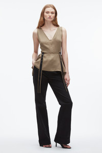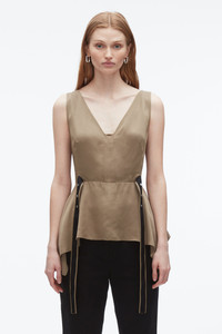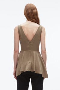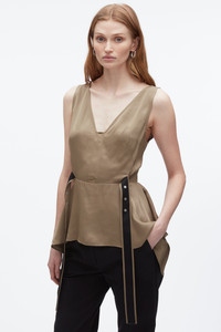 Crafted from satin-faced fabric with a soft, liquid shine, this sculptural top balances romance with restraint. The deep V-neckline and flounced hem create airy movement, while contrast grosgrain straps and snap detailing ground the look with quiet edge. Its versatility is key—style it with a bias-cut slip skirt for effortless cocktail dressing, or layer it under summer suiting for a polished take on everyday pragmatism. - 100% Viscose - Model is 5'10', Bust: 30', Waist: 23', Hips: 34' and wearing a size 4 - Professional dry clean only