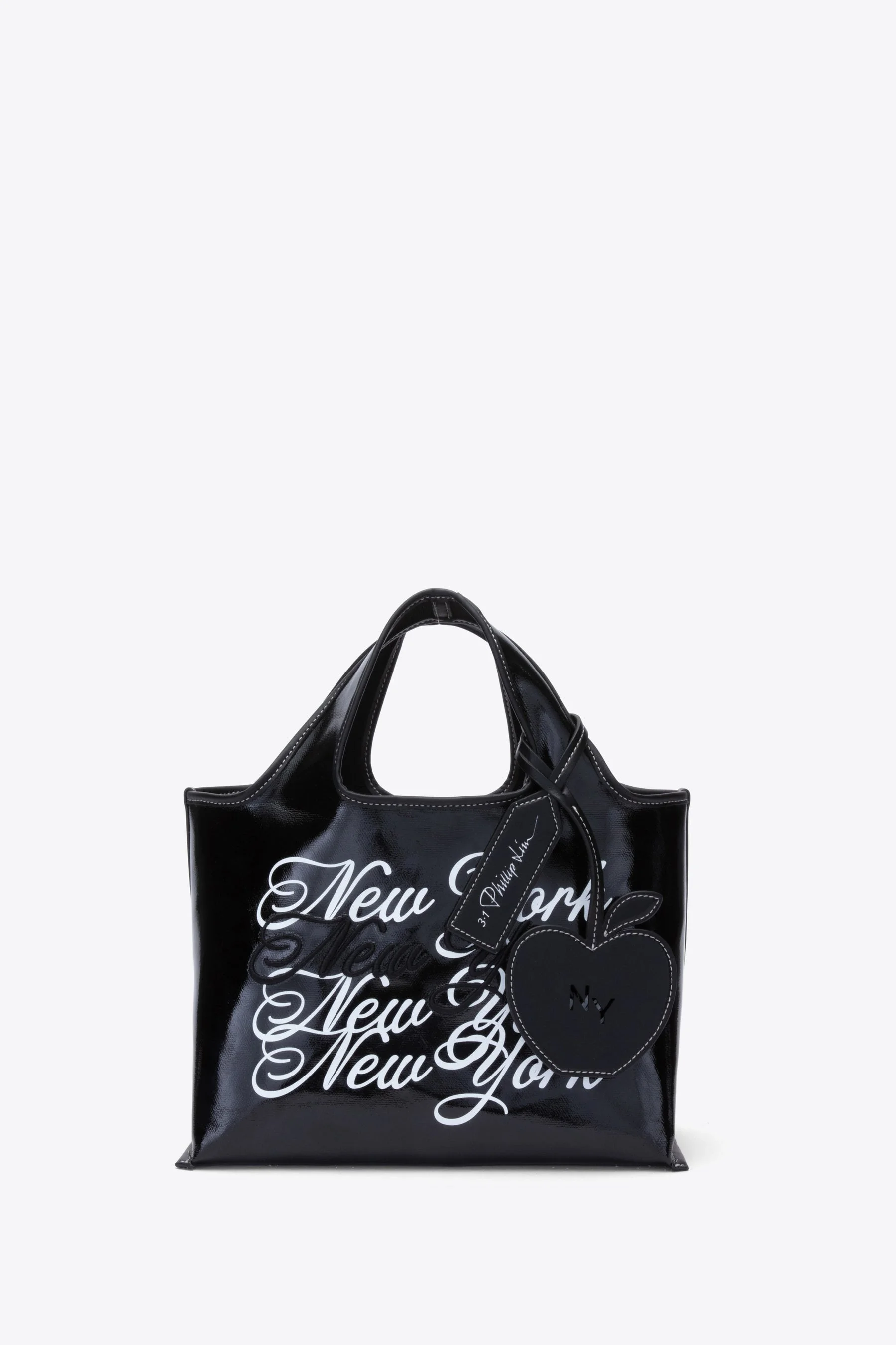 Mini market tote is a playful take on a lunch bag, realized in laminated canvas and adorn with "WE ARE NY" graphic and embroidery. Apple bag charm with a silver-tone metal logo plaque is a cheeky homage to our home city. - 100% Cotton - Height: 8" - Width: 13" - Depth: 5" - Handle Drop: 4.5
