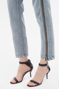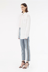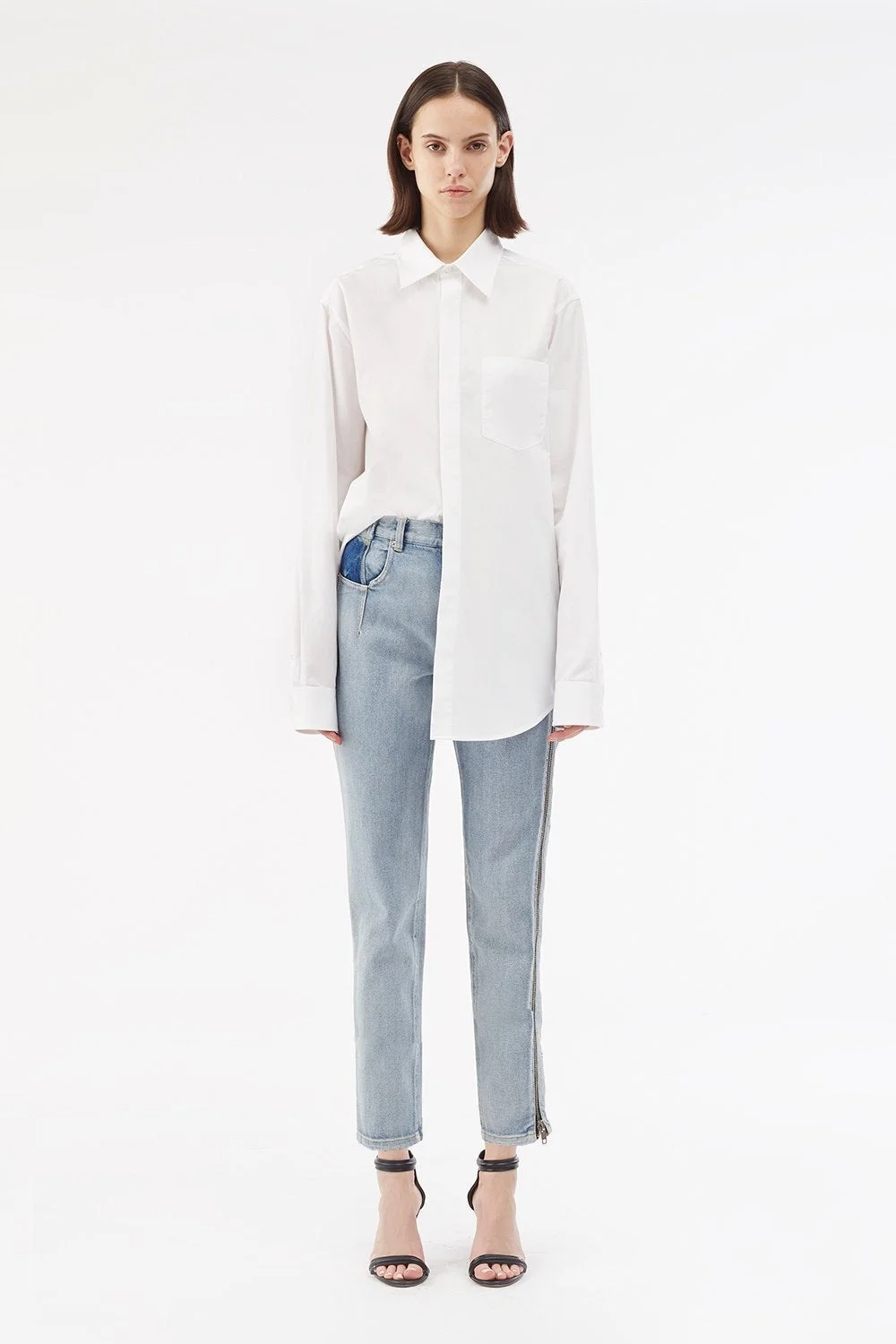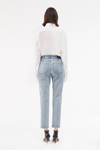 Denim goes decidedly unconventional in this cropped trouser from our spring runway. The style is all about audacious asymmetry, reworking the lines of a five-pocket classic with overlapping seams, a functional zipper on one leg that extends from hip to hem and off-center darting to pull it all together. This style runs large, we recommend ordering one size down from you normal size.