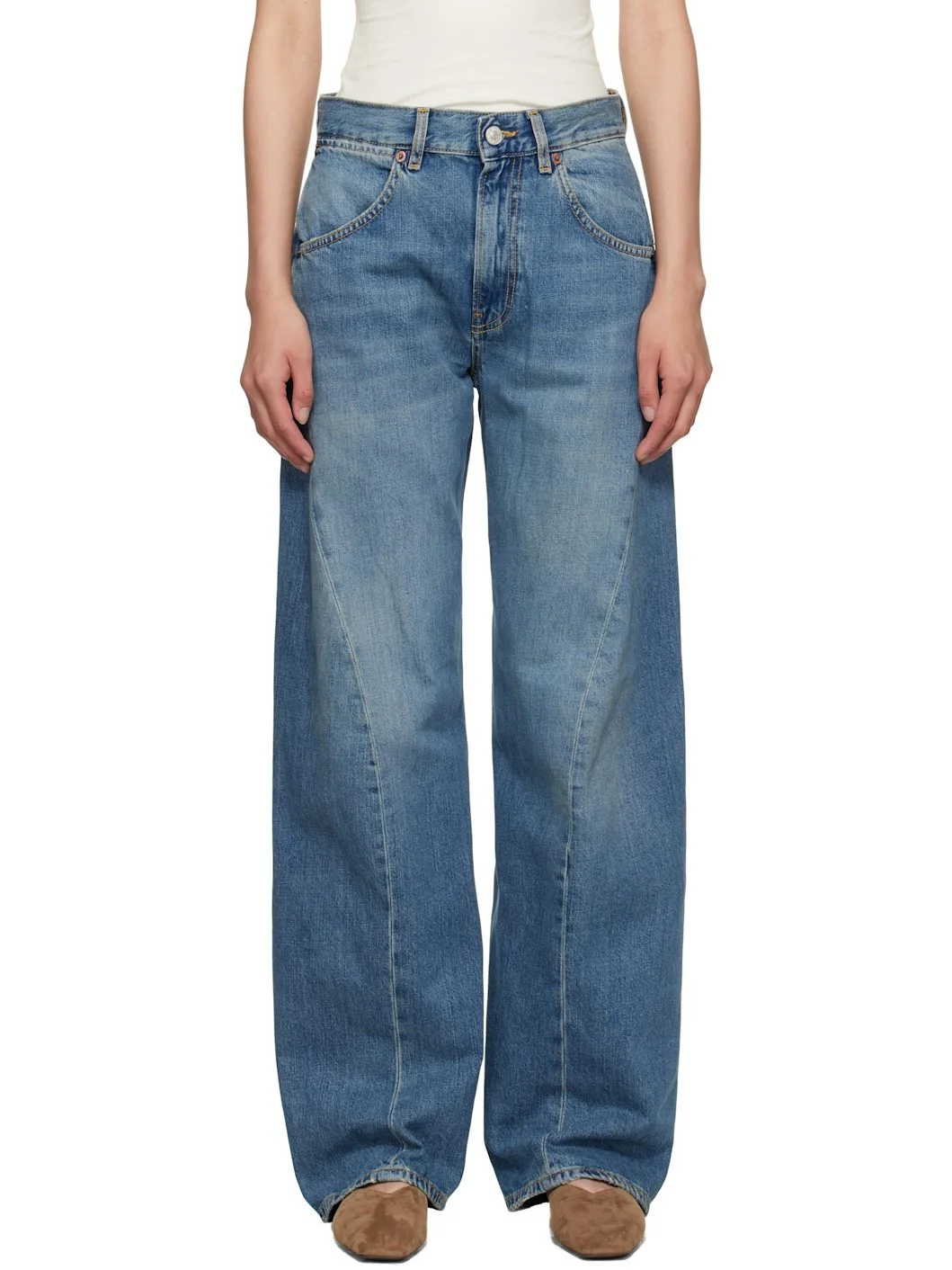 Non-stretch denim jeans. · Fading and whiskering throughout · Wide-leg · Mid-rise · Belt loops · Five-pocket styling · Zip fly · Twisted inseams and outseams · Subtle distressing at cuffs · Adjustable cinch tab at back waistband · Logo patch at back waistband · Contrast stitching in beige Supplier color: Soft mid blue 100% cotton. Made in Italy 252446F069007