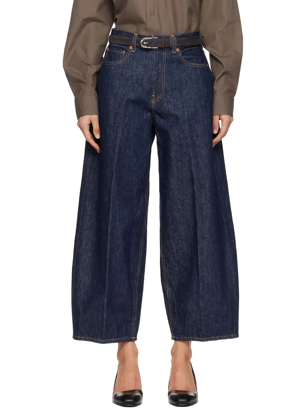 Non-stretch denim jeans. · Wide-leg · High-rise · Belt loops · Five-pocket styling · Zip fly · Cropped leg · Logo patch at back waistband · Contrast stitching in tan Supplier color: Rinsed raw 100% cotton. Made in Italy 261446F069007
