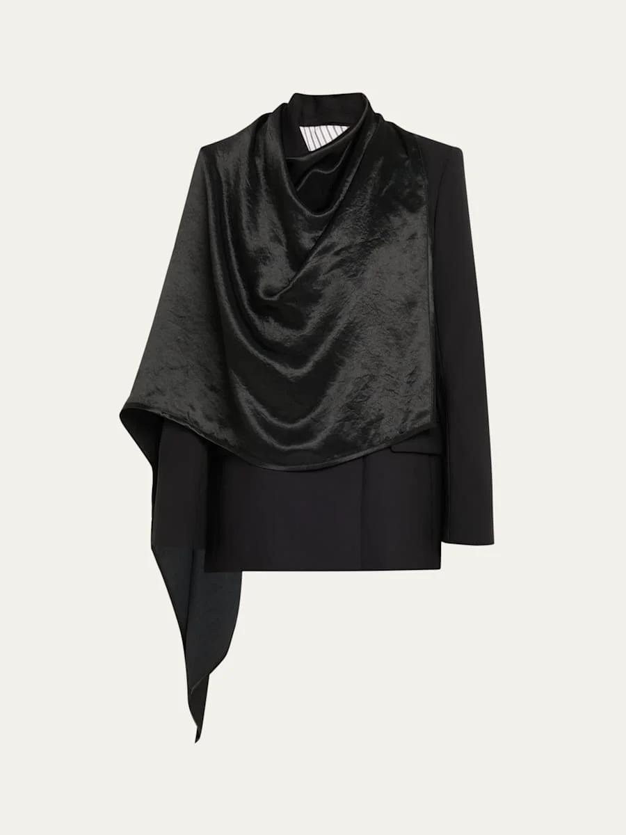 6397 double-breasted blazer merges sharp suiting lines with a fluid draped overlay, balancing structure and ease. Shawl neckline Long sleeves Three-button cuffs Detachable satin overlay Double-vented back Tailored fit Button front closure Wool/elastane/acetate Lining: Organic cotton/rayon Dry clean Made in Poland This product contains perfluoroalkyl and polyfluoroalkyl substances (PFAS). For more information, please visit the manufacturer’s website. Online Inquiries: BGS21_T8SEQ| Store Inquiries: #5405276