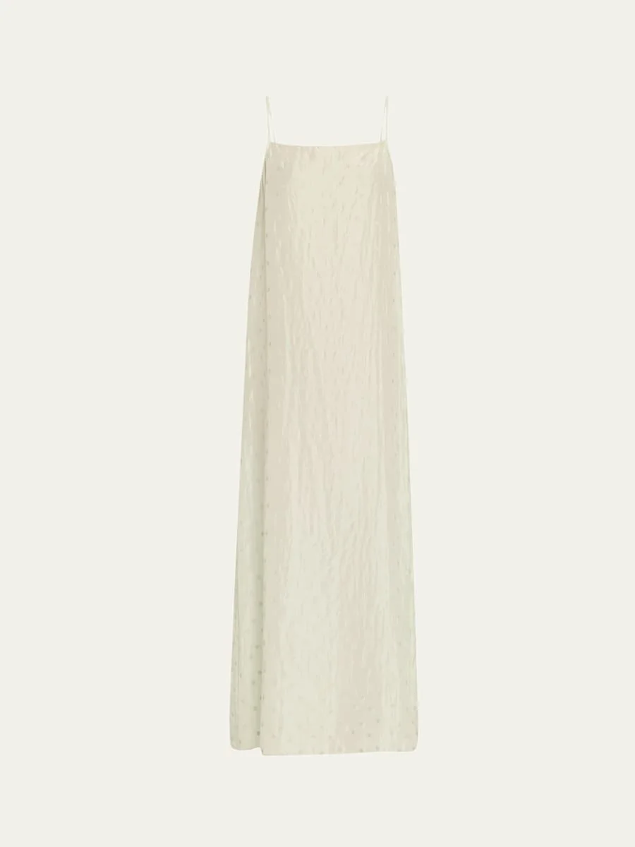 6397 embroidered polka dot maxi dress in luxurious silk Square neckline Sleeveless Slip silhouette Center back vent Slipover style Silk Dry clean Imported Online Inquiries: BGS21_T6U89| Store Inquiries: #5036844