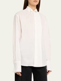 6397 crisp cotton shirt adorned with micro pleating Point collar Long sleeves with button cuffs Classic fit Hem falls to the hip Hidden buttonfront Cotton Dry clean Imported