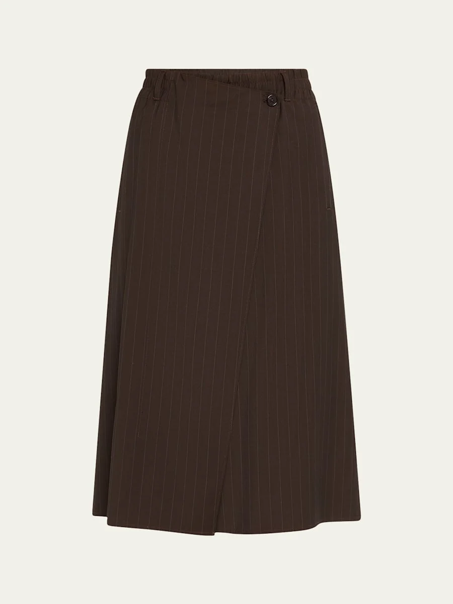6397 pinstripe shorts in wool-blend High rise Elastic waistband Side pockets; back welt pockets Wrap front Hem hits below the knee Side button closure Wool/polyester Dry clean Imported Online Inquiries: BGS21_T6U83| Store Inquiries: #5036838