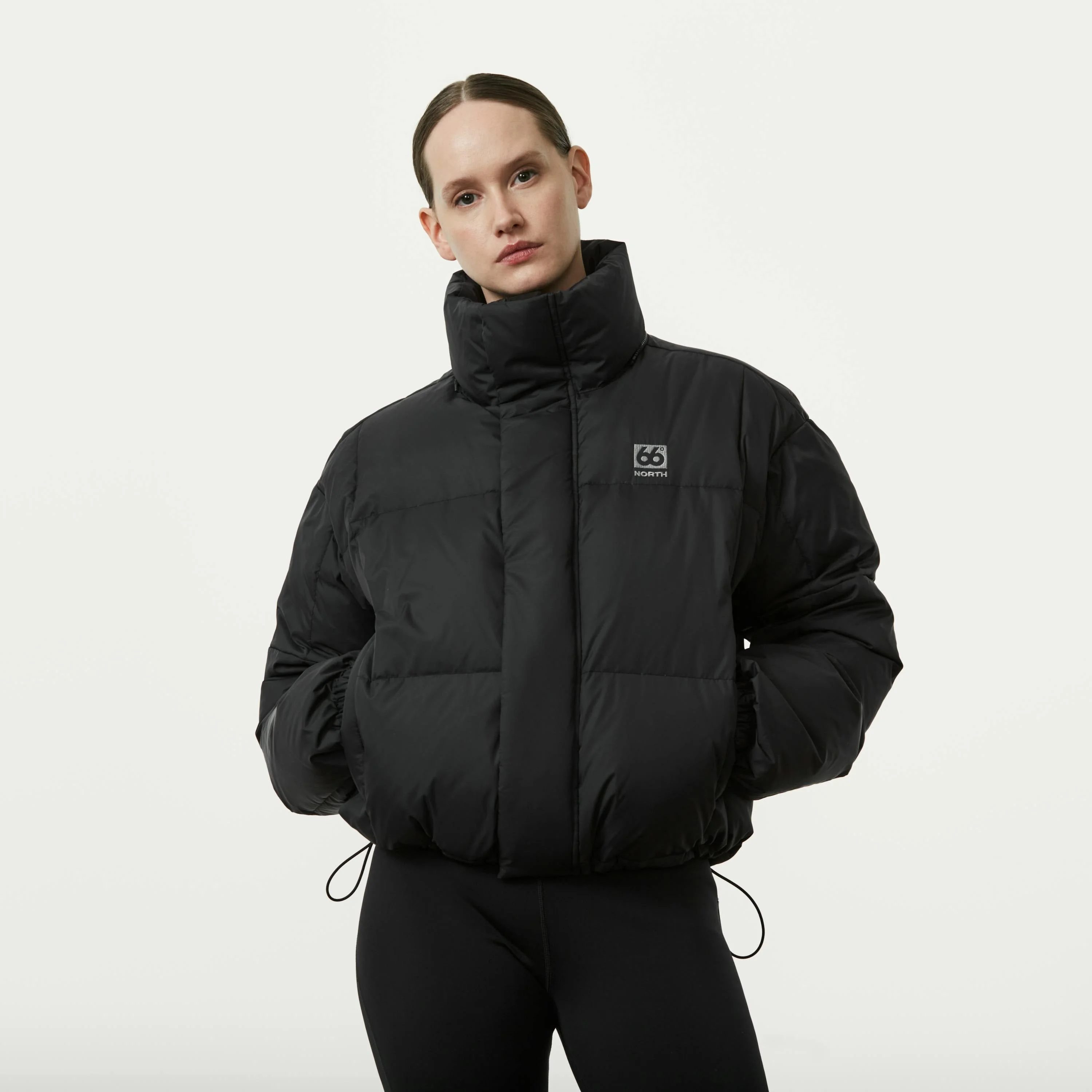 Dyngja down cropped jacket is puffy and incredibly warm. With square quilting, the jacket is insulated with high-quality 700 fill-power recycled down, while the outer layer is made of recycled polyester. Our Dyngja collection is based on a bestselling down coat from the early 2000s, designed equally with city life and outdoor winter adventures in mind. The jacket is incredibly warm and features a high down-filled collar and a draw-cord hood for shelter. Depending on your style or climate preferences, the hood can be zipped on or off. A snapped downwind flap prevents the wind from blowing through the zipper. The jacket also includes two zippered front pockets, one inside pocket, and a drawstring at the waist to adjust the fit. To secure the hood on the jacket so the zipper does not open, the pull tab needs to be laid flat against the zipper teeth, following the zipper's path. Ensure that the pull tab does not stick out beyond the hood. The recycled down is reclaimed from used clothing and bedding, diverting waste from landfills and extending the lifecycle of the natural filling. The cleaning, sterilizing, and processing methods used for recycled down are nearly identical to those employed for virgin down, resulting in a final product with first-rate standards in cleanliness and performance. Dyngja ensures protection from the cold and keeps you comfortable throughout your everyday commute. Female model is 175 cm / 5' 8" tall and wearing size M DETAILS AND CARE Repairs for life. Outer Layer - Main fabric 100% Recycled Polyamide Inner Layer - Insulation 100% Recycled Polyester Inner Layer - Insulation 700 fill power: 80% Recycled down (goose and duck mix), 20% Feather Suitable for Everyday / Commuting Functionality Wind-protection Water-resistant Style Down Jackets