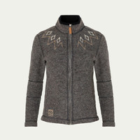 Technical wool Icelandic sweater in a slim fit with an embroidered abstract interpretation of our country's traditional sweaters. Fleece-lined collar for comfort. Leather zipper pulls are embossed with the logo. Articulated elbows for closer fit. Sizes are small, we recommend you go up one size. Female model is 178 cm / 5' 10" tall and wearing size M DETAILS AND CARE Repairs for life. Outer Layer - Main fabric 75% Wool, 25% Polyester Shell Wool Style Knitwear & Wool