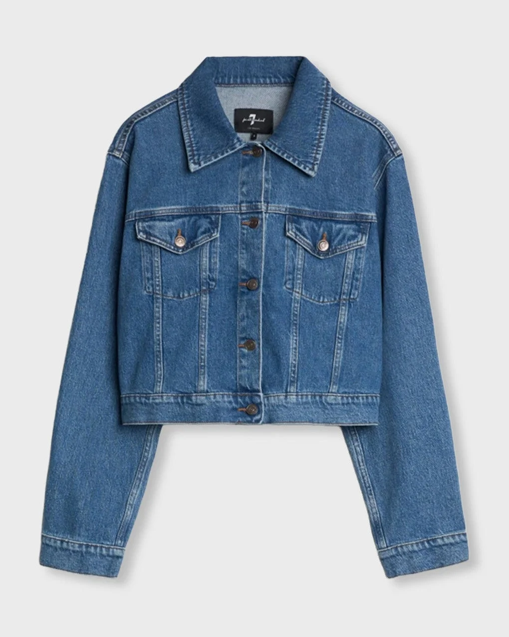 Jacket Nellie Weekend from 7 For All Mankind. A trendy, classic denim jacket in medium-blue wash with a relaxed fit. It features front button closure, flap chest pockets, and signature seam detailing. Made from a comfortable cotton blend with a touch of stretch for added ease of movement. A versatile piece, perfect for both everyday wear and more dressed-up occasions. Size and Fit - Fits true to size, choose your usual size - The model is 175 cm tall and is wearing size S Specification - Article number - ID: 175087-024 - Brand: 7 For All Mankind - Color: Denim - Washing Instructions: Machine wash - Made of: 99% Cotton 1% Elastane