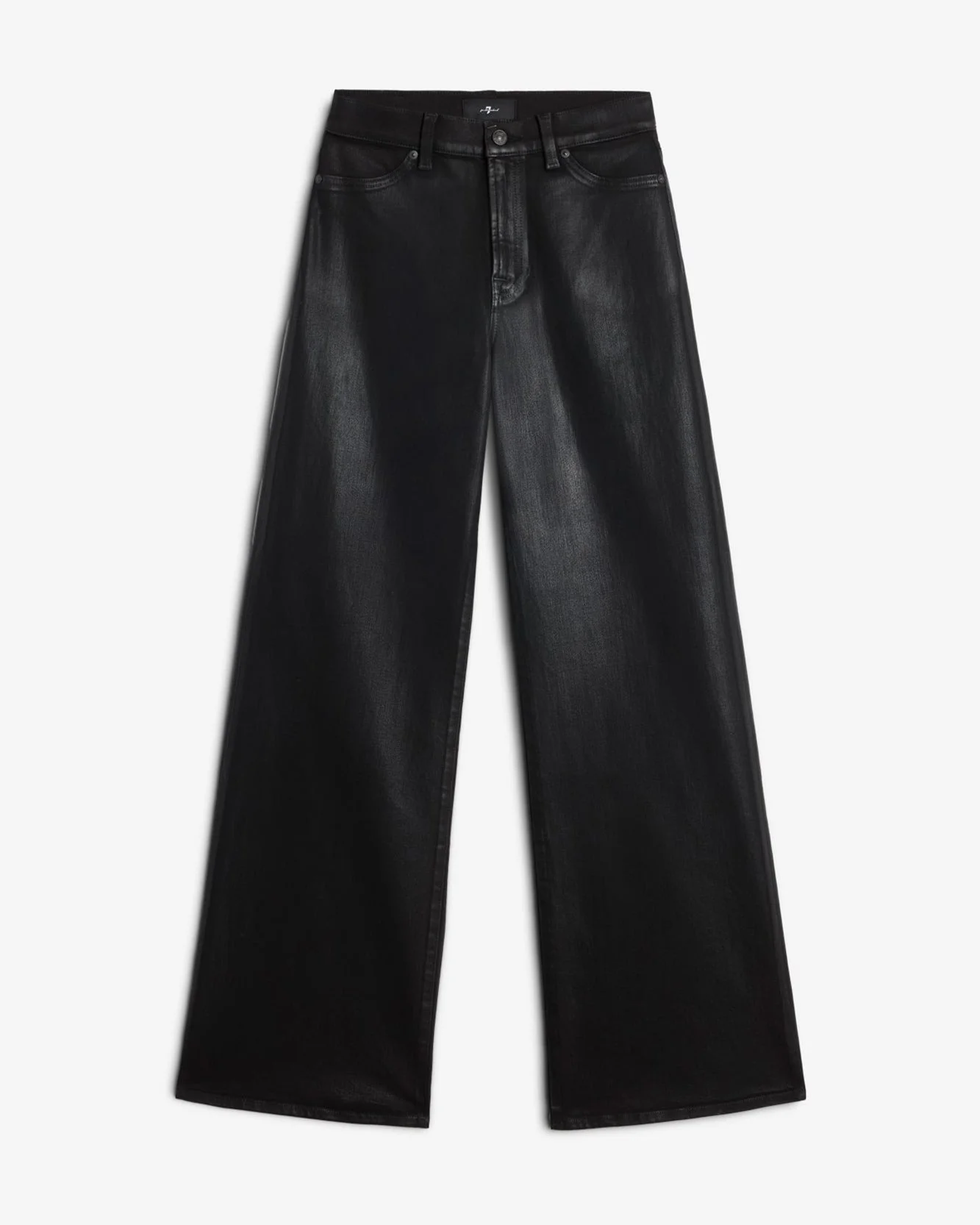 Fits like: A high rise fit that contours the waist and hips before falling into an easy, full-length wide leg. Feels like: The comfort and stretch of 7 denim with the look of leather. The Details: - Black wash - Coated denim - Subtle sheen for a cool, elevated style - Zip fly with button closure - Clean back pocket MEASUREMENTS - Based on size: 27 - Rise: 10.75" - Leg Opening: 24.25" - Approx. Inseam: 34" - Measurements may vary based on size, fabric, and wash. FABRIC & CARE - 71% Cotton, 20% Viscose, 7% Elastomultiester, 2% Elastane - Machine wash cold inside out with like colors, lay flat to dry - Imported