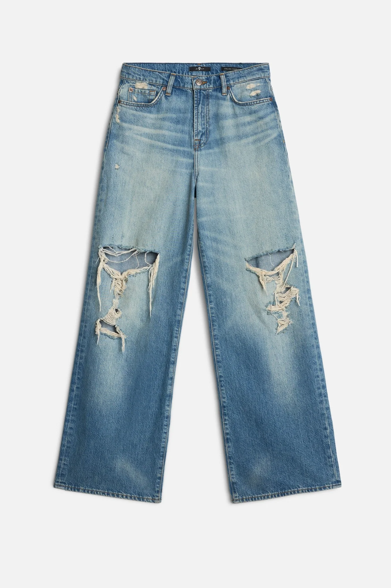 Fits like: A wide-leg fit with a relaxed, full-length silhouette that flows effortlessly for a bold yet laid-back vibe. Feels like: Classic rigid denim that's structured and timeless, designed to hold its shape while softening with wear for that authentic, vintage-inspired feel. The Details: - Medium wash - Zip fly with button closure - Destroyed detailing at the knees for a naturally worn-in look FABRIC & CARE - 100% Cotton - Machine wash cold inside out with like colors, lay flat to dry - Imported
