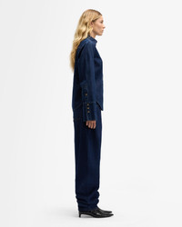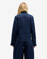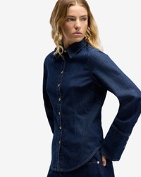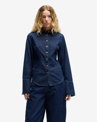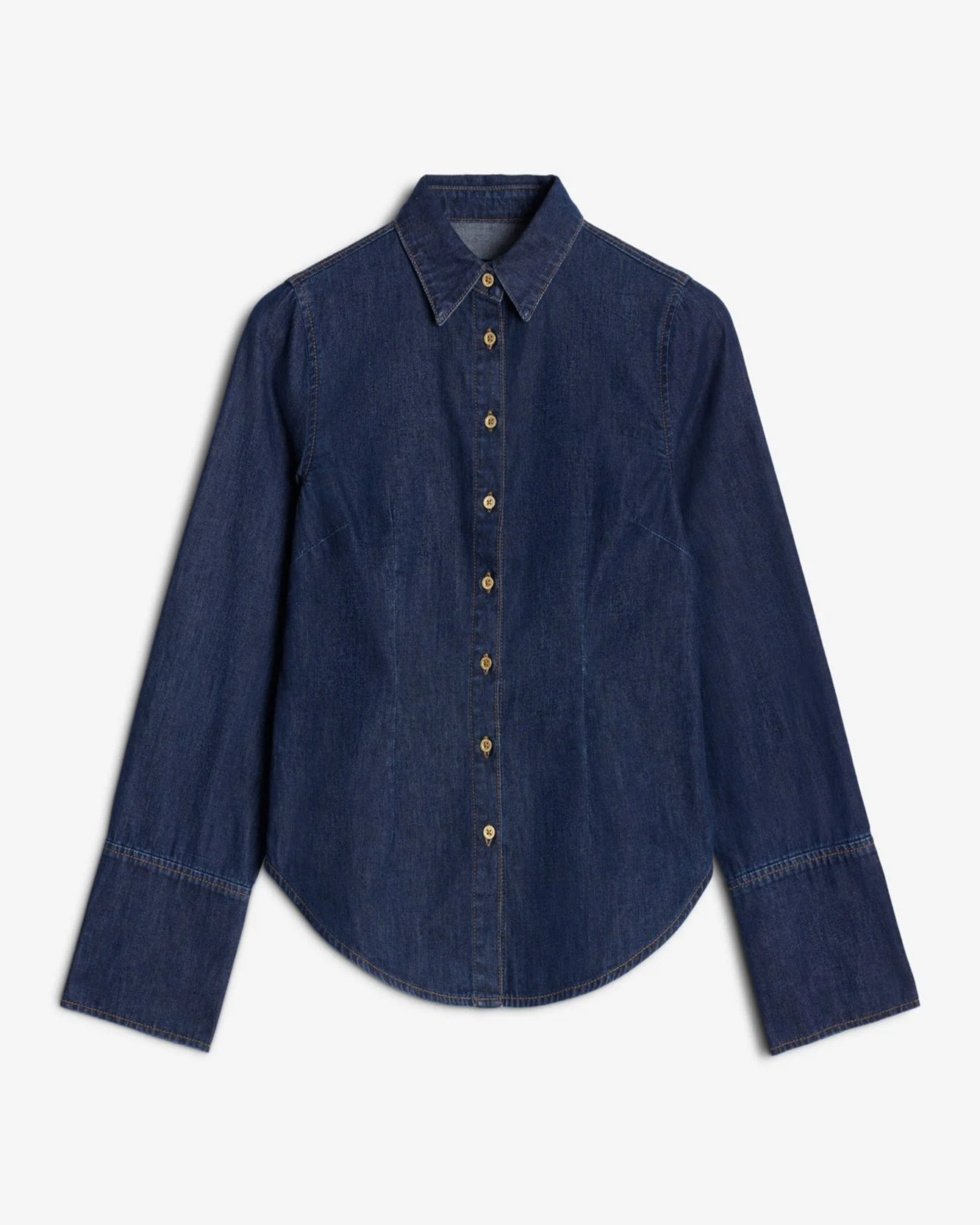 Fits like: Tailored through the waist with a subtle flare at the hem; structured yet feminine. Feels like: A grounded, structured denim that develops softness and character with every wear. The Details: - Dark wash - Classic point collar - Elongated cuffs and curved hem for modern polish - Full placket closure - Gold-tone buttons for elevated contrast FABRIC & CARE - 100% Cotton - Machine wash cold inside out with like colors, lay flat to dry - Imported