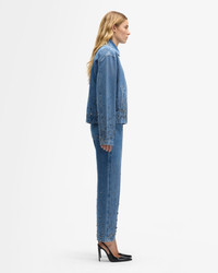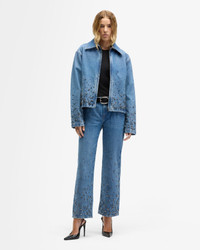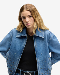 Fits like: Relaxed through the body with a boxy, slightly cropped shape that layers with ease. Dropped shoulders and wide sleeves lend it a cool, unstructured feel. Feels like: A grounded, structured denim that develops softness and character with every wear. The Details: - Medium wash - Classic point collar - Metallic stud and crystal embellishments along the hem and sleeves - Subtle fading for a lived-in look - Clean zip-front closure for a sleek finish - Welted pockets - Tonal stitching FABRIC & CARE - 100% Cotton - Machine wash cold inside out with like colors, lay flat to dry - Imported