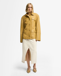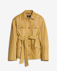 Fits like: A classic Sahariana-style jacket with a tailored yet relaxed fit and a belted waist for a cinched, flattering silhouette. Feels like: Smooth and luxurious, crafted from premium genuine leather for a rich texture and timeless durability. The Details: - Honey shade - Made in Italy - Four front patch pockets for a utility-inspired look - Belted waist for adjustable styling - Button-front closures with sleek metallic accents FABRIC & CARE - 100% Leather - Professional Leather Cleaning - Imported