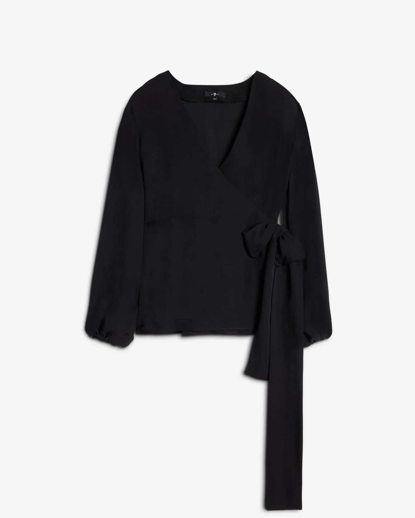 Fits like: Gently cinched at the waist with soft volume through the sleeves. This wrap silhouette flatters with ease and femininity. Feels like: Silky-smooth and lightweight, crafted from premium silk for a soft, luxurious feel with a natural drape. The Details: - Classic black - 100% Silk - V-neckline - Wrap front with tie closure for customizable fit - slightly ballooned sleeves with buttoned cuffs FABRIC & CARE - 100% Silk - Dry clean only - Imported