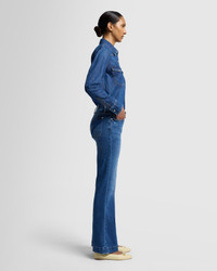Fits like: Fitted through the hips and thighs. This mid-rise denim has a wide full-length leg and a subtle flare for a long, lean silhouette. Featuring a shorter inseam than our original Dojo, so you won't need to go to the tailor. Feels like: A classic and authentic denim feel with subtle stretch to it. The Details: - Medium blue wash - Zip closure - Subtle whiskering and sanding along the thighs - Embroidered 7 back pockets in contrast navy stitch - Wide trouser hem detail MEASUREMENTS - Based on size 27 - Rise: 9.25" - Approx Inseam: 32" - Leg Opening: 21.75" - Measurements may vary based on size, fabric, and wash. FABRIC & CARE - 86% Cotton, 12% Polyester, 2% Spandex - Machine wash cold inside out with like colors, lay flat to dry - Imported