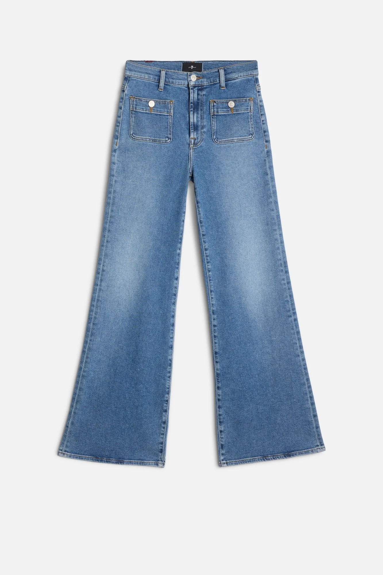 Fits like:Fitted through the hips and thighs, this high-rise style opens into a wider flare with a shorter inseam that delivers a sleek, tailored look off the rack. Feels like:Midweight denim with a broken-in softness that feels like an old favorite from the first wear. The Details: - Mid wash - Zip fly with button closure - Clean back pocket - Signature waistband tab and back pocket flag - Whiskering and fading along the thighs