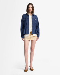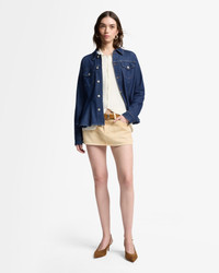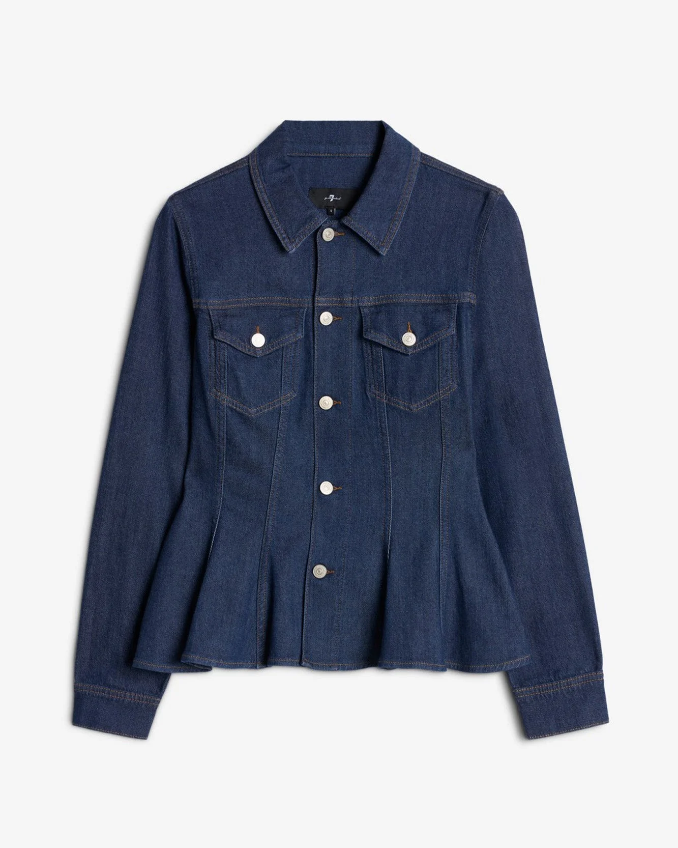 Fits like: Slim through the shoulders and waist, then flaring into a soft peplum for a feminine, waist-defining silhouette. Feels like: Light, and soft—crafted for ease with the comfort of stretch cotton. The Details: - Dark Wash - Point collar - Front and back princess seams - Flared shape adding a twist to the classic trucker - Flap chest pockets - Front button closure FABRIC & CARE - 48% Modal, 48% Cotton, 3% Polyester, 1% Elastane - Machine wash cold inside out with like colors, lay flat to dry - Imported