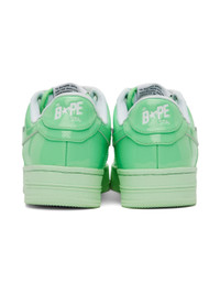 Low-top patent leather sneakers in green. · Perforated detailing at round toe · Logo hardware at lace up closure · Logo patch at padded tongue · Padded collar · Logo patch at sides · Logo embossed at heel tab · Mesh lining · Logo embossed at textured rubber midsole · Treaded rubber outsole Supplier color: Green