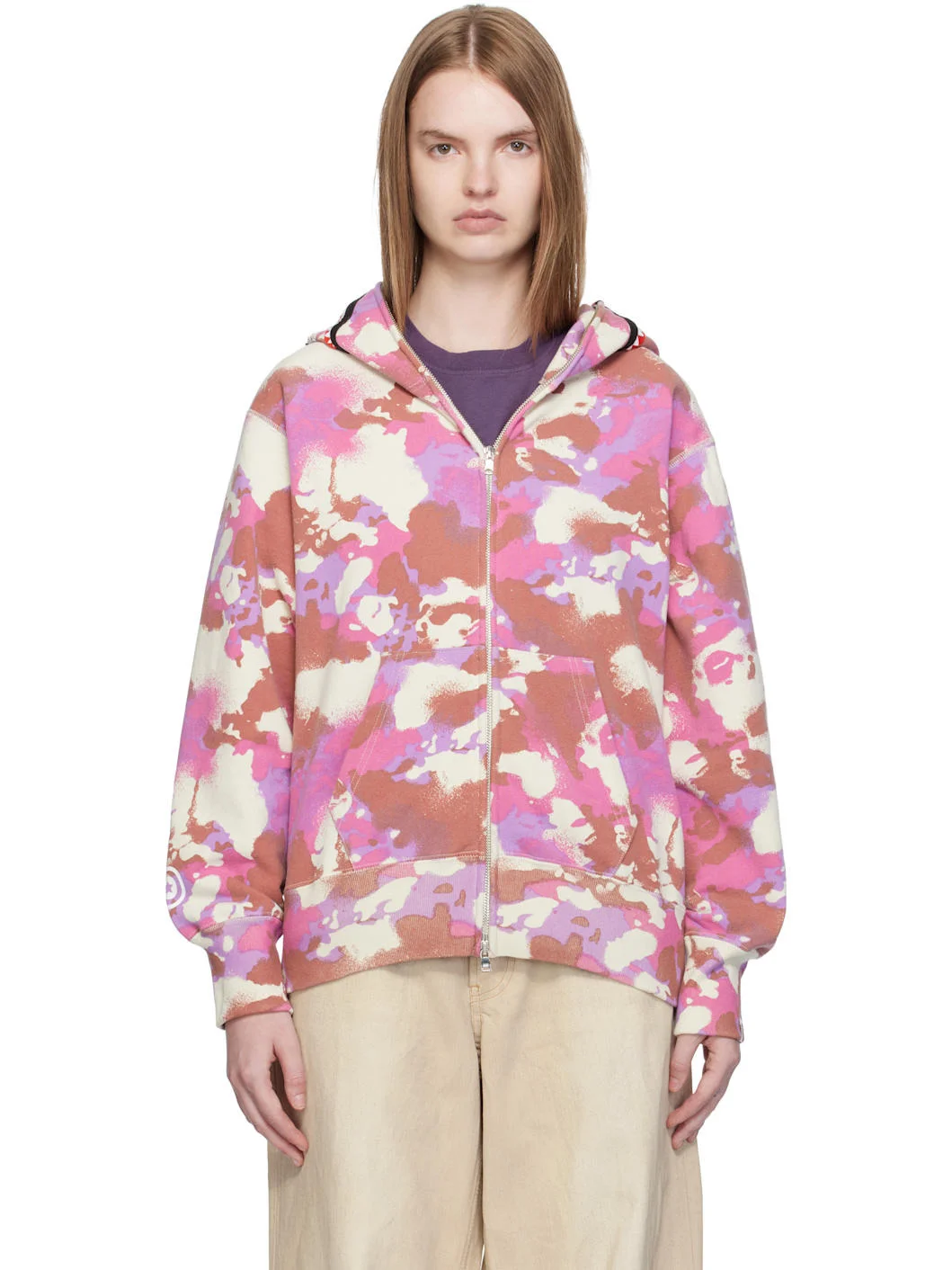 French terry hoodie. · Logo camouflage pattern printed throughout · Printed graphic and graphic appliques at hood · Two-way zip closure extends to hood · Patch pockets at front · Rib-knit hem and cuffs · Logo flag at cuff Supplier color: Pink 100% cotton. Made in Japan 251546F097007