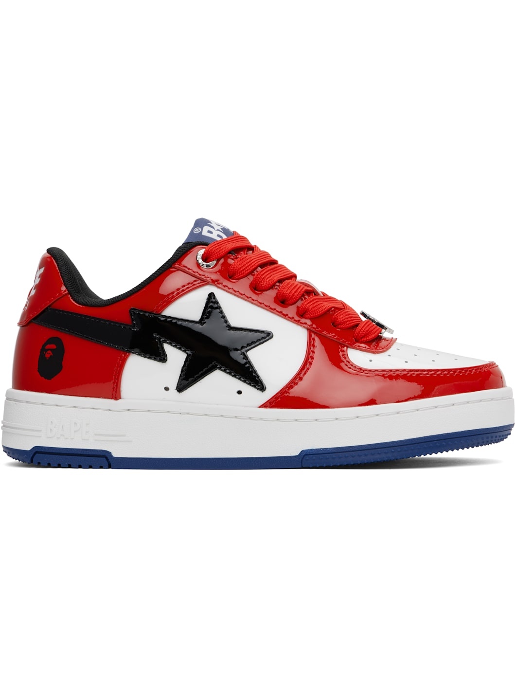 Low-top patent leather sneakers in red and white. · Perforated detailing at toe and sides · Logo hardware at lace-up closure · Logo patch at padded tongue · Padded collar · Graphic applique at sides · Logo embossed at outer side · Logo embossed at heel tab · Mesh lining · Logo embossed at textured rubber midsole · Treaded rubber sole Supplier color: Red