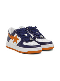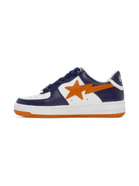 Low-top paneled buffed leather sneakers in navy and orange. · Perforated detailing at toe and outer side · Logo hardware at lace-up closure · Logo patch at padded tongue · Padded collar · Graphic applique at sides · Logo graphic embossed at outer side · Logo embossed at heel tab · Buffed leather lining · Logo embossed at textured rubber midsole · Treaded rubber sole Supplier color: Blue