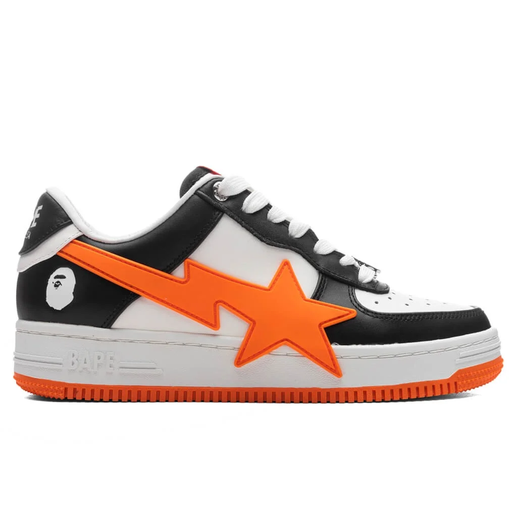 The Women's Bape Sta OS #2 M2 in White, Black and Orange from A Bathing Ape. This iconic sneaker features a perforated toe box for a stylish and breathable design. The lace-up closure is accented with logo hardware, while the padded tongue boasts a prominent logo patch. Comfort is ensured with a padded collar and a padded mesh footbed. The signature logoapplique sits on the sides and extends onto the midsole, and a logo is embossed on the heel tab. - Logo hardware at lace-up closure - Logo patch at padded tongue - Padded collar - Logo applique at sides - Logo embossed at heel tab - Padded mesh footbed - All sizes are listed in US Women's sizing unless stated otherwise - Buffed leather lining - Style No: 001FWK702309L-BLK