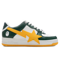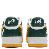 The Women's Bape Sta OS #2 M2 in White, Green and Yellow from A Bathing Ape. This iconic sneaker features a perforated toe box for a stylish and breathable design. The lace-up closure is accented with logo hardware, while the padded tongue boasts a prominent logo patch. Comfort is ensured with a padded collar and a padded mesh footbed. The signature logoapplique sits on the sides and extends onto the midsole, and a logo is embossed on the heel tab. - Logo hardware at lace-up closure - Logo patch at padded tongue - Padded collar - Logo applique at sides - Logo embossed at heel tab - Padded mesh footbed - All sizes are listed in US Women's sizing unless stated otherwise - Buffed leather lining - Style No: 001FWK702309L-GRN