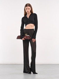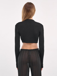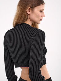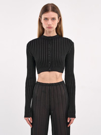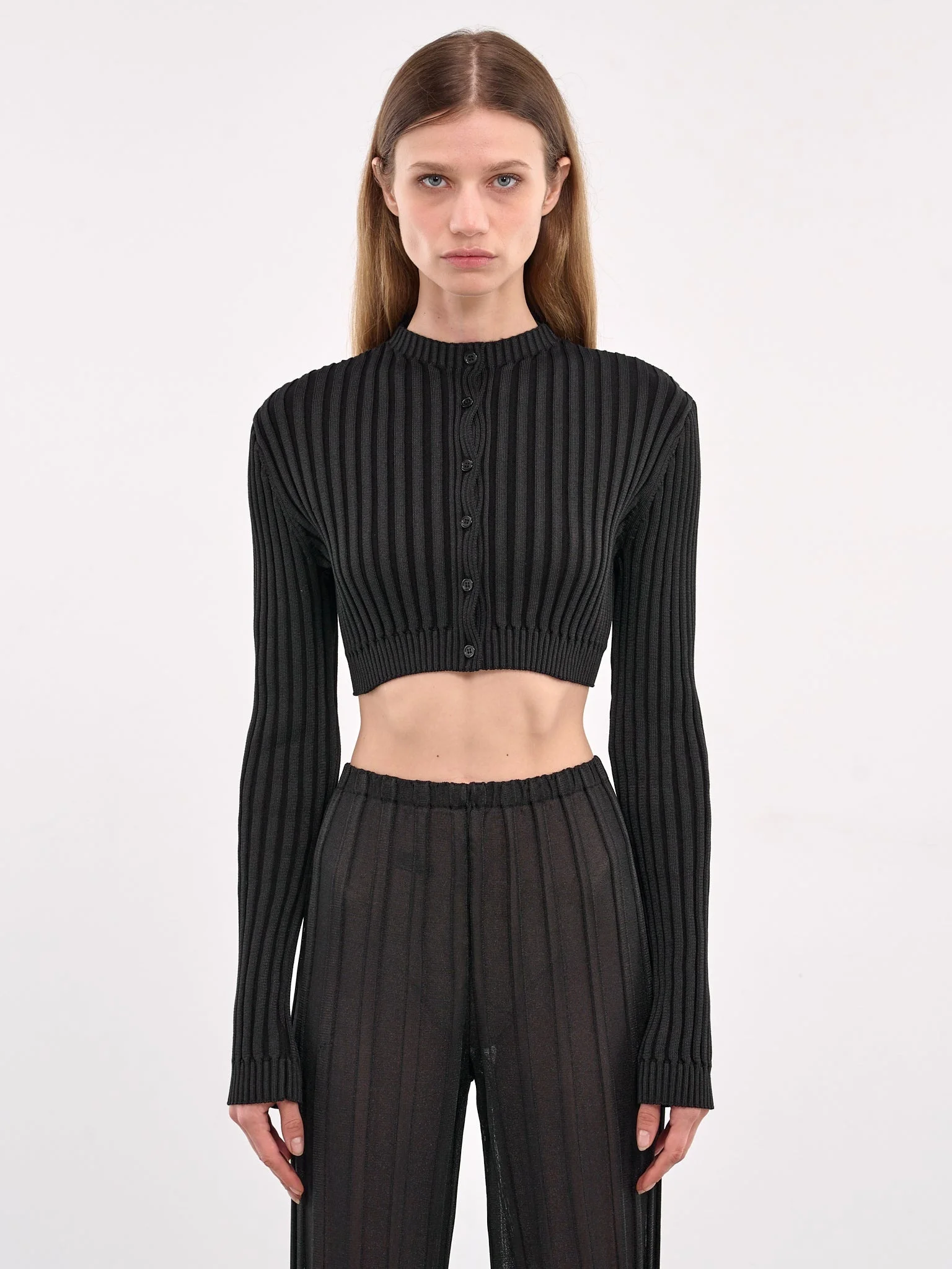 A. ROEGE HOVE cardigan in black, paneled knit construction, ribbed crewneck, front button placket closure, long sleeves, straight hem, cropped length, slim fit. Standard Sizing Model is 5'9" wearing size S. Bust: 32" Waist: 23" Hips: 34"