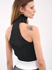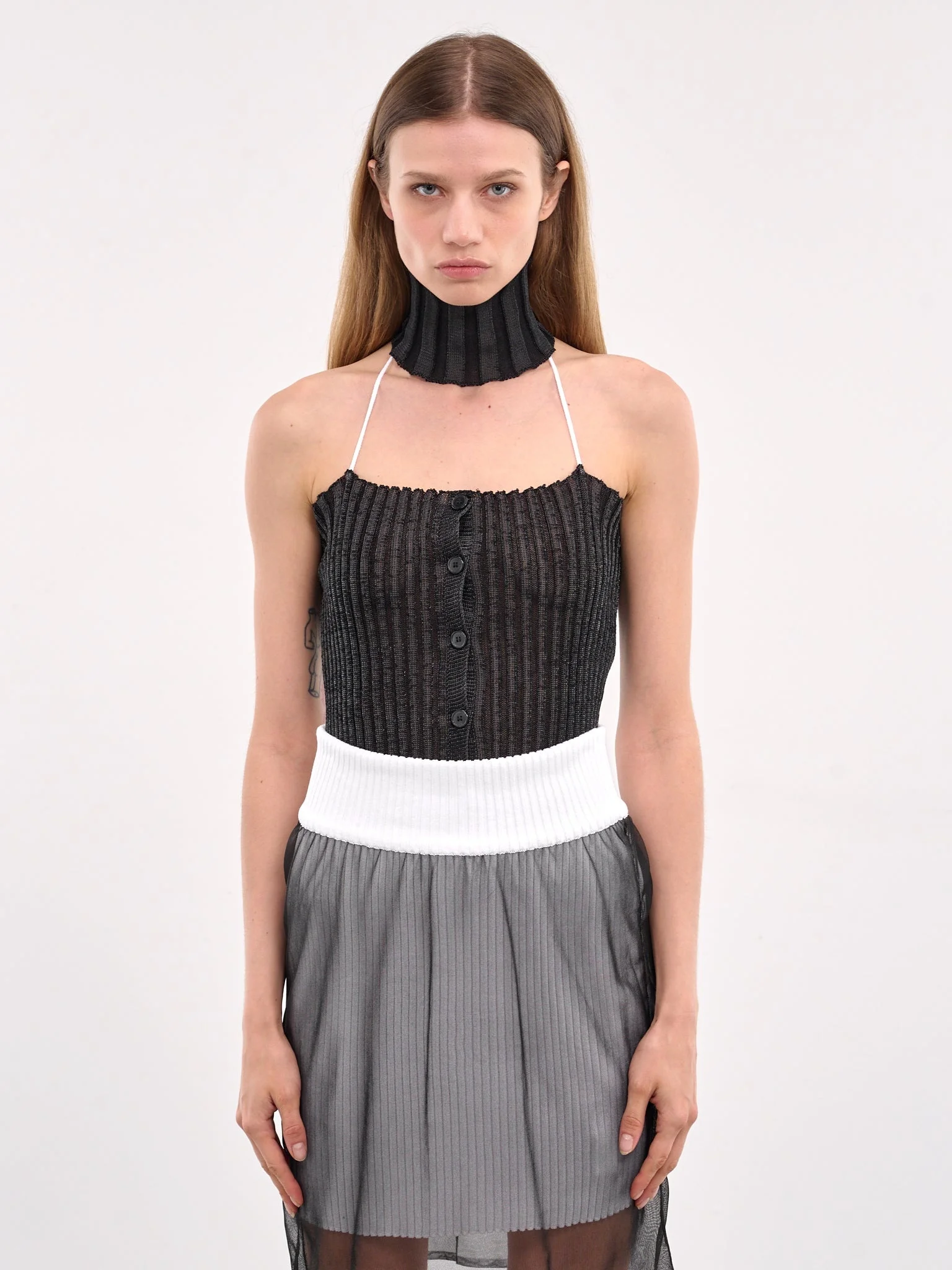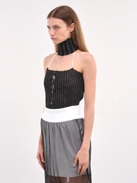 A. ROEGE HOVE tank in black, deconstructed design, paneled knit construction, rib-knit, semi-sheer, turtleneck, front deconstructed paneling & spaghetti straps, racerback, sleeveless, armscyes, front button placket closure, straight hem, slim fit. Standard Sizing Model is 5'9" wearing size S. Bust: 32" Waist: 23" Hips: 34"