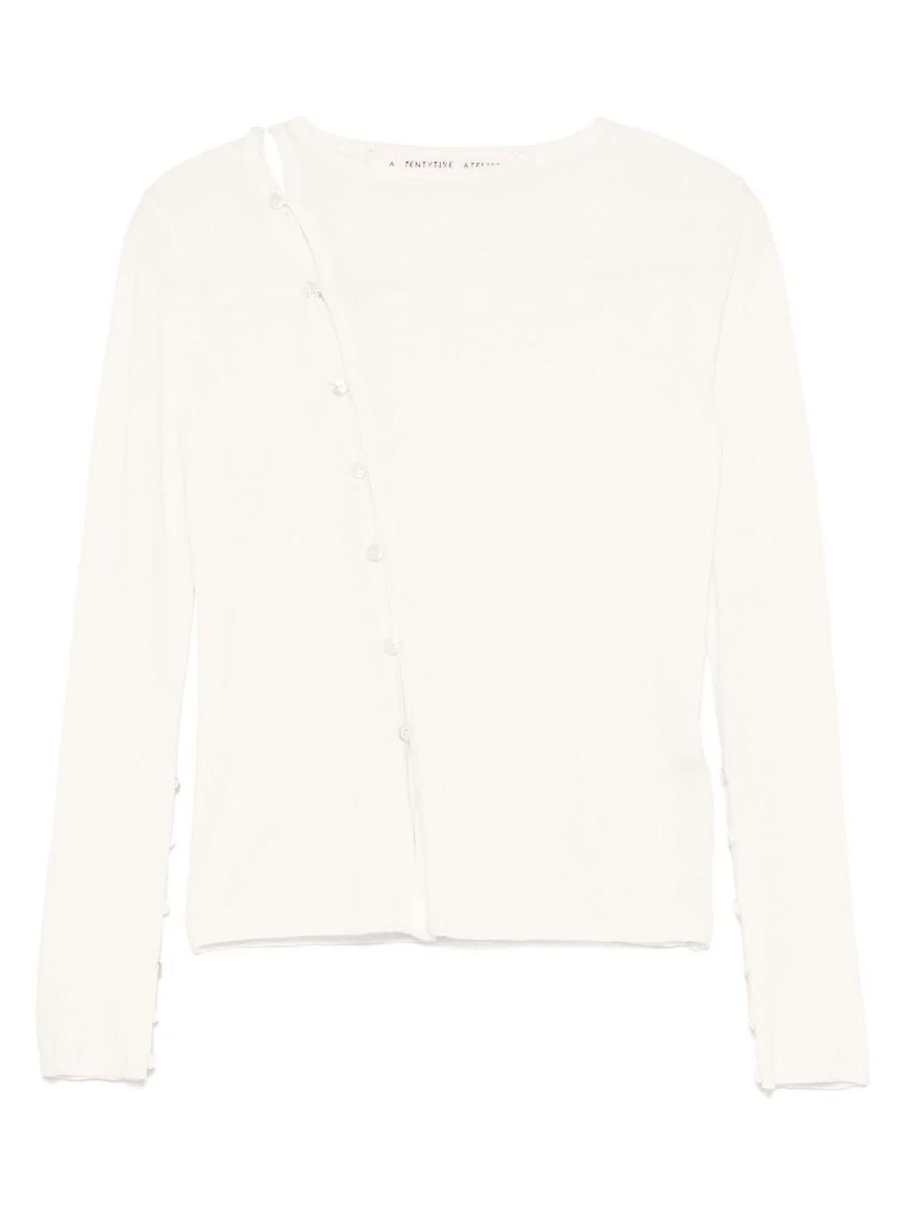 asymmetric top Highlights - White - Crew neck - Long sleeves - Straight hem Imported Composition Virgin Wool 70%, Silk 30% SIZE & FIT Model measurements Height 5 ft 10 in(1.79 m) Bust/Chest 35.43 in(90 cm) Hips 35.03 in(89 cm) Waist 25.19 in(64 cm) FittingInformation Designed for a slim fit that sits just away from the body offering a close yet comfortable fit Made with a lightweight knit, this piece offers some stretch Washing instructions Dry Clean Only