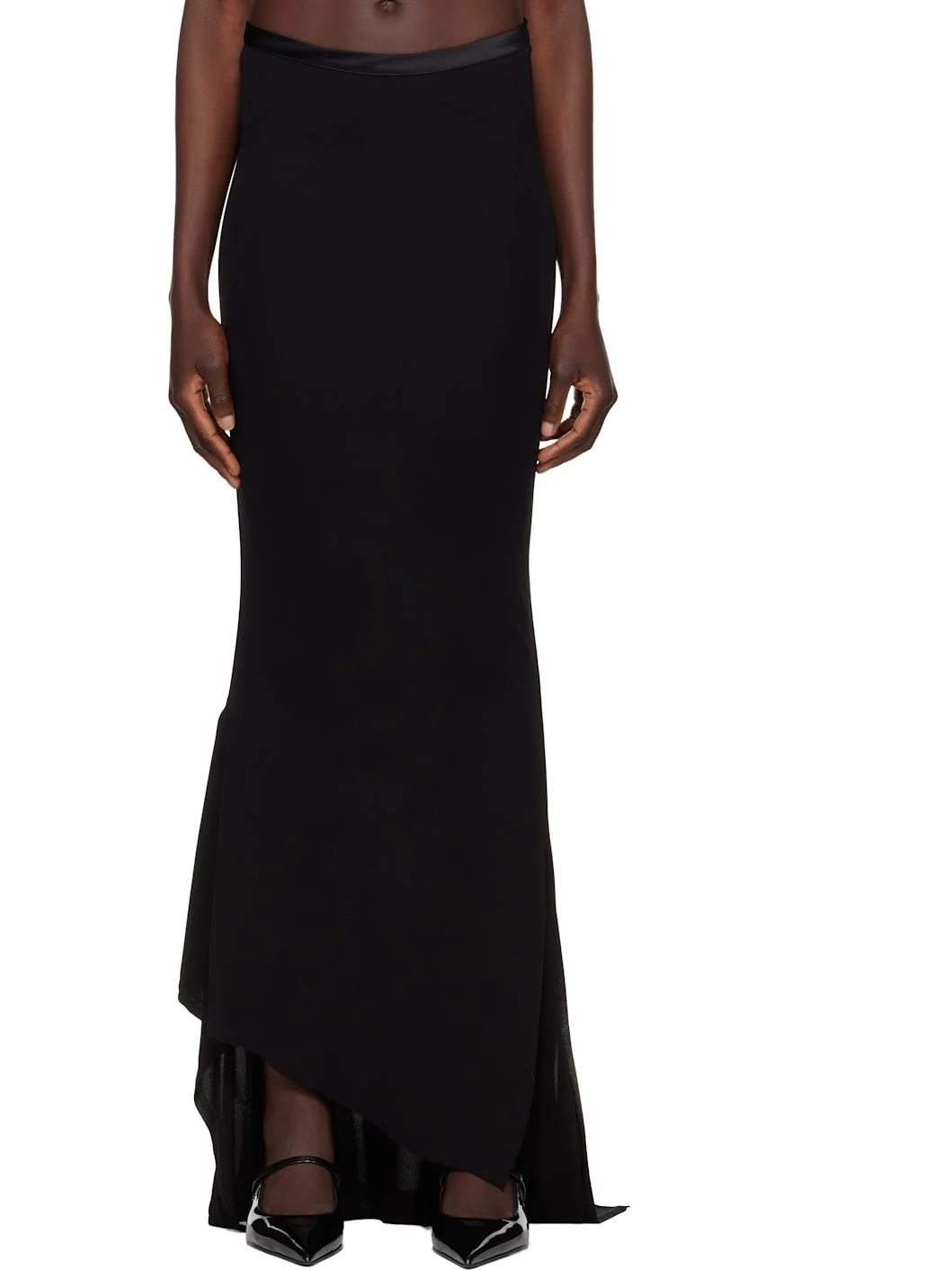 Semi-sheer viscose crepe maxi skirt. · High-rise · Satin waistband · Zip and hook-eye closure at back waist · Asymmetrical hem Supplier color: Black Body: 100% viscose. Trim: 100% polyester. Made in United Kingdom 251678F093003