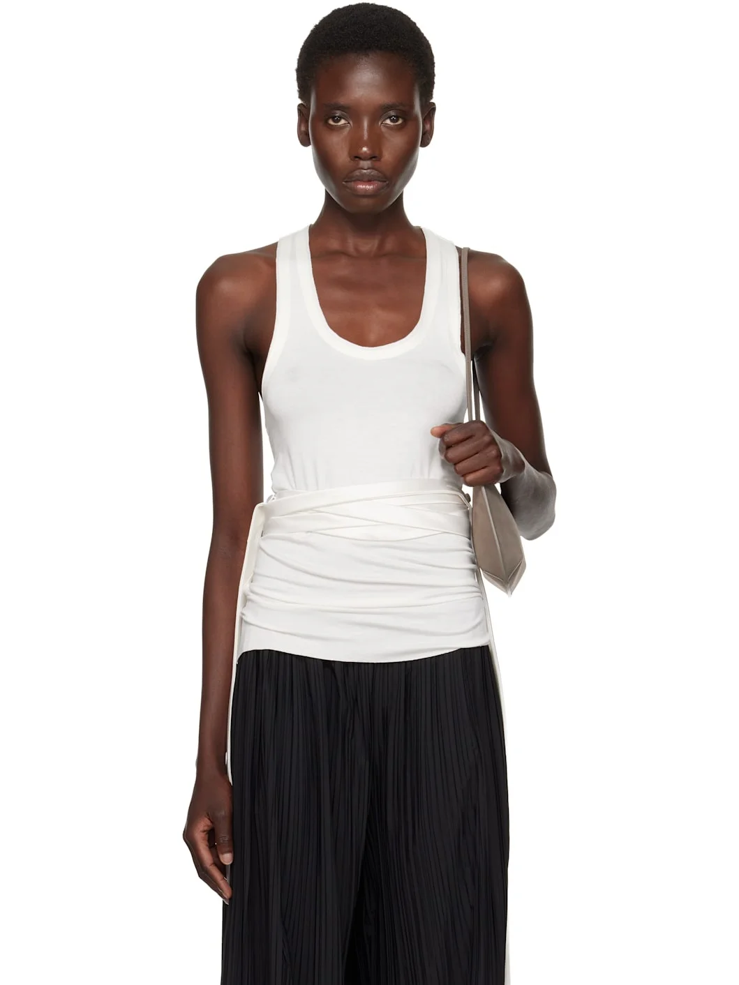 Viscose jersey tank top. · Scoop neck · Self-tie straps at side seams · Raw edge at hem · Racer back · Satin-covered seams at interior Supplier color: White Body: 100% viscose. Trim: 100% polyester. Made in United Kingdom 251678F111001