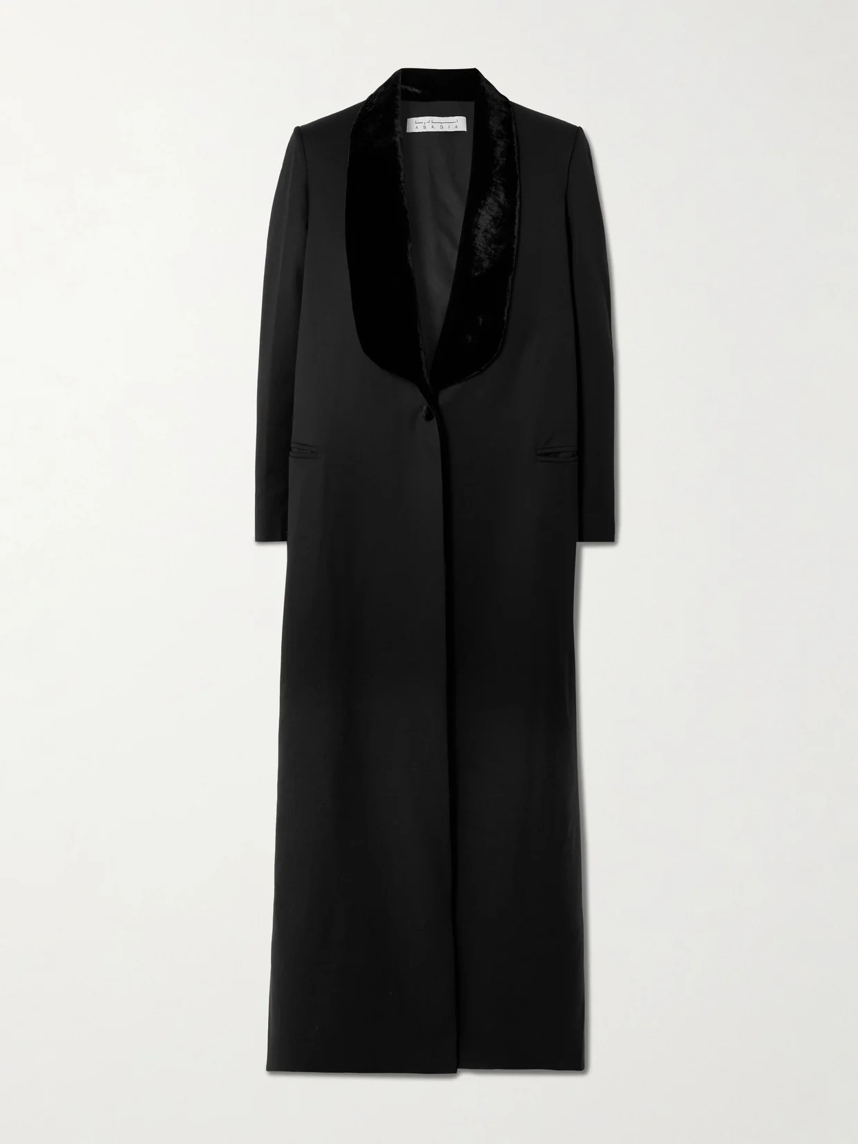 Abadia's "signature aesthetic of combining feminine ease with masculine structure" translates to this 'Joud' coat. It's tailored from textured wool-blend twill and has a shawl lapel made from soft crushed-velvet. The maxi style is polished with discreet welt pockets and closes with a single fabric-covered button.