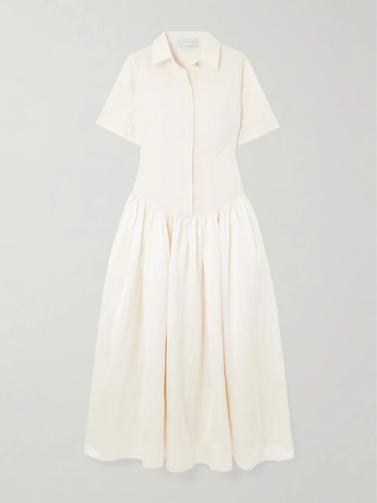 Combining elements of tailoring and feminine detailing, Abadia's 'Mena' dress is the definition of "casual elegance". It's designed with a poplin shirt and falls to a drop waist and gathered dupioni skirt - the curved, sculptural shape perfectly balances the slim bodice. Complement the gold-tone top button with coordinating earrings.