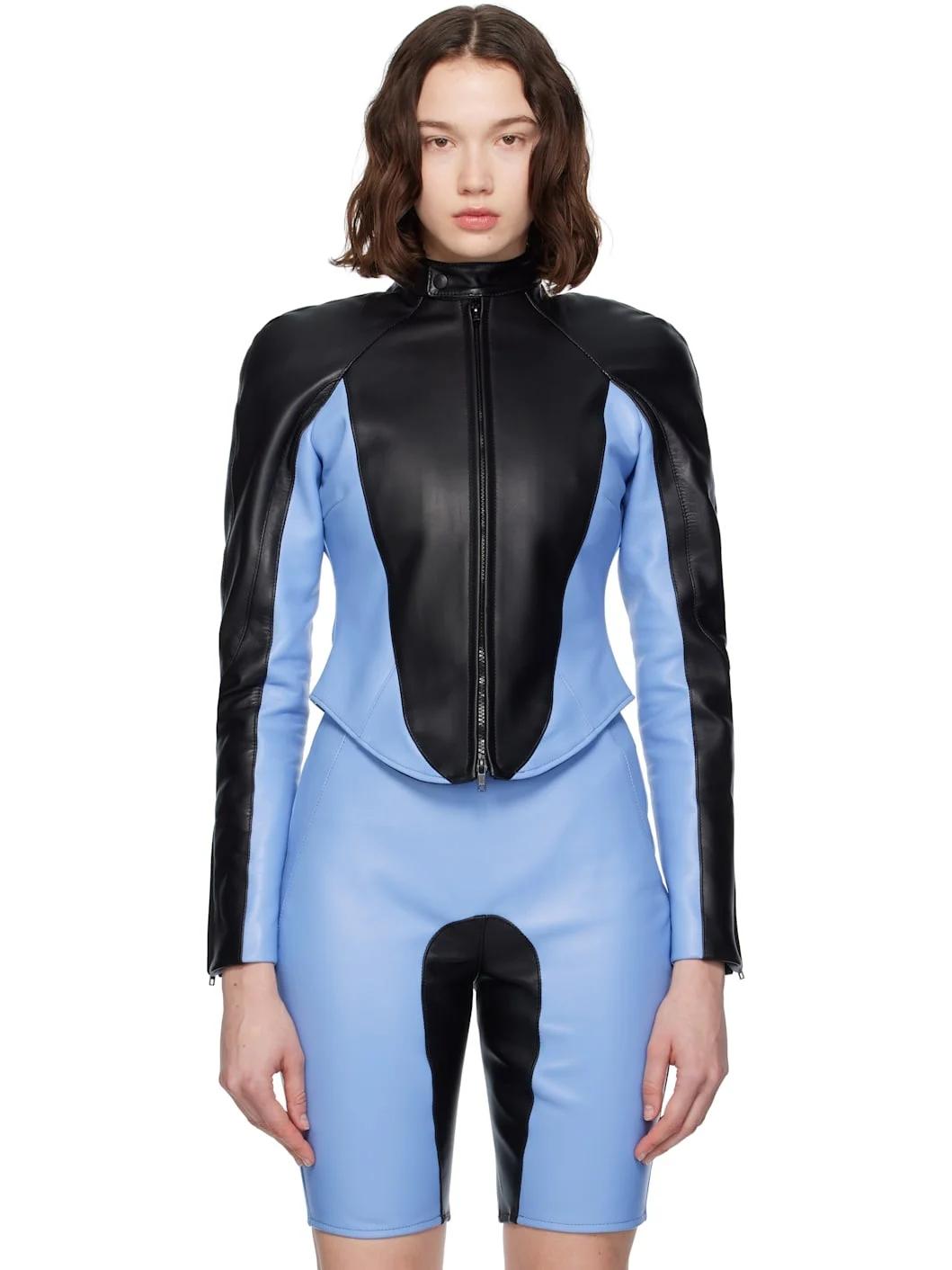 Grained leather jacket. · Press-stud tab at band collar · Two-way zip closure · Curved hem · Raglan sleeves · Zip vent at cuffs · Twill lining Supplier color: Black/Blue 100% leather. Made in Portugal 252526F063002
