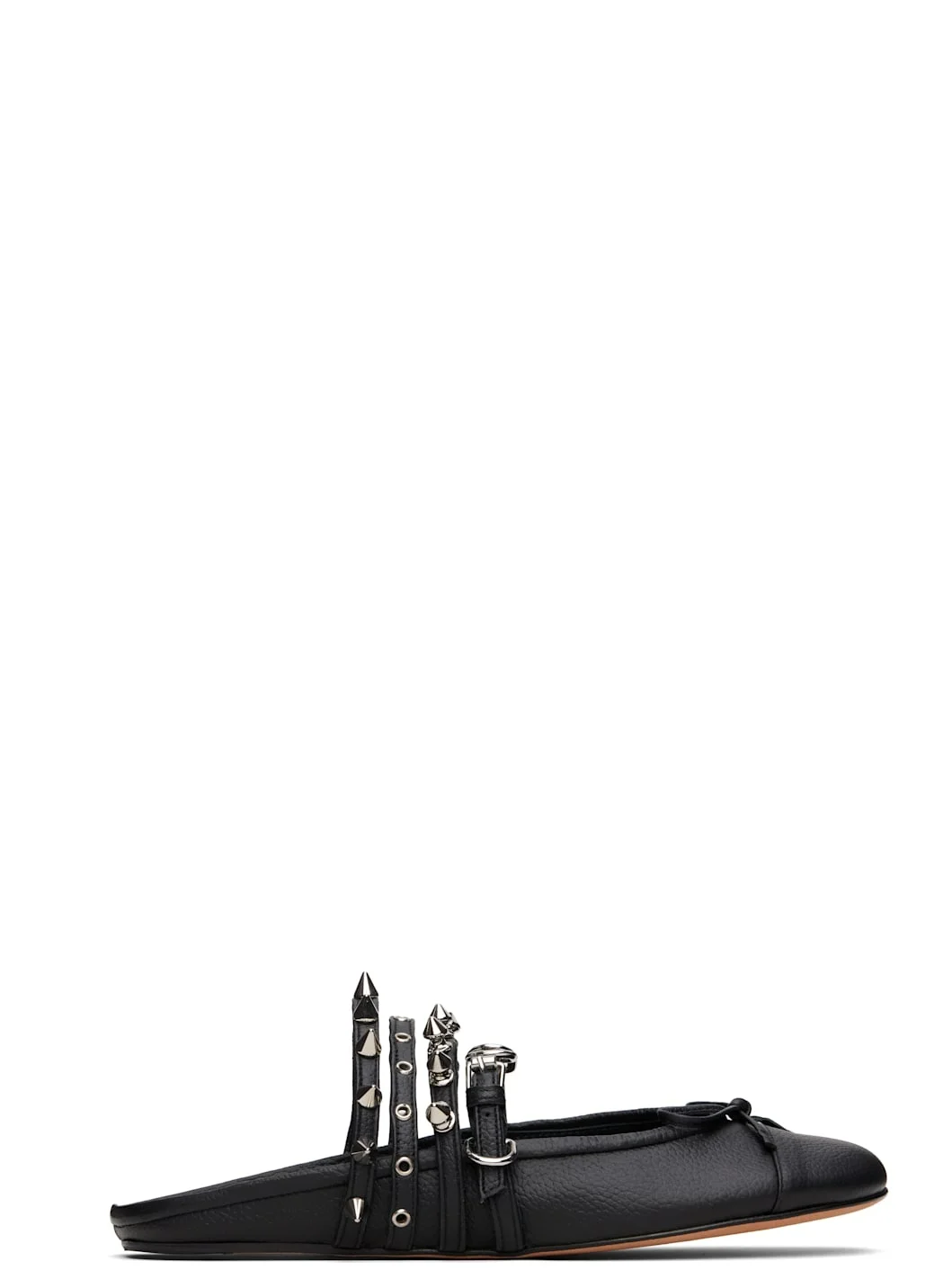 Grained leather ballerina-style mules in black. · Square toe · Bow accent at vamp · Pin-buckle strap with D-rings at vamp · Grommets and studs at elasticized vamp straps · Logo stamp at leather footbed · Grained leather lining · Leather sole with rubber injection Supplier color: Black Upper: leather. Sole: leather, rubber. Made in Spain 252526F121001