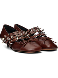 Crinkled leather Mary Jane-style heels. · Square toe · Bow accent and pin-buckle strap at vamp · Elasticized straps with studs and eyelets · Buffed leather lining · Covered kitten heel with rubber injection · Leather sole Supplier color: Chocolate brown Upper: leather. Sole: leather, rubber. Made in Spain 261526F122001