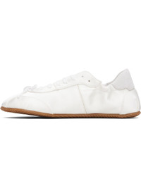 Low-top satin sneakers in white. · Square toe · Bow accent at vamp · Lace-up closure · Logo embroidered at padded tongue · Elasticized collar · Logo embroidered at suede heel tab · Nubuck and jersey lining · Treaded rubber sole Supplier color: White Upper: textile, leather. Sole: rubber. Made in Spain 252526F128005
