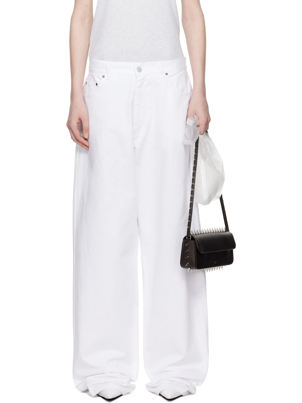 Wide-leg non-stretch denim jeans. · Belt loops · Five-pocket styling · Zip-fly · Leather logo patch at back waistband · Logo-engraved silver-tone hardware Supplier color: White 100% cotton. Made in Portugal 251526F069004