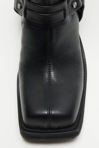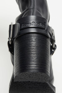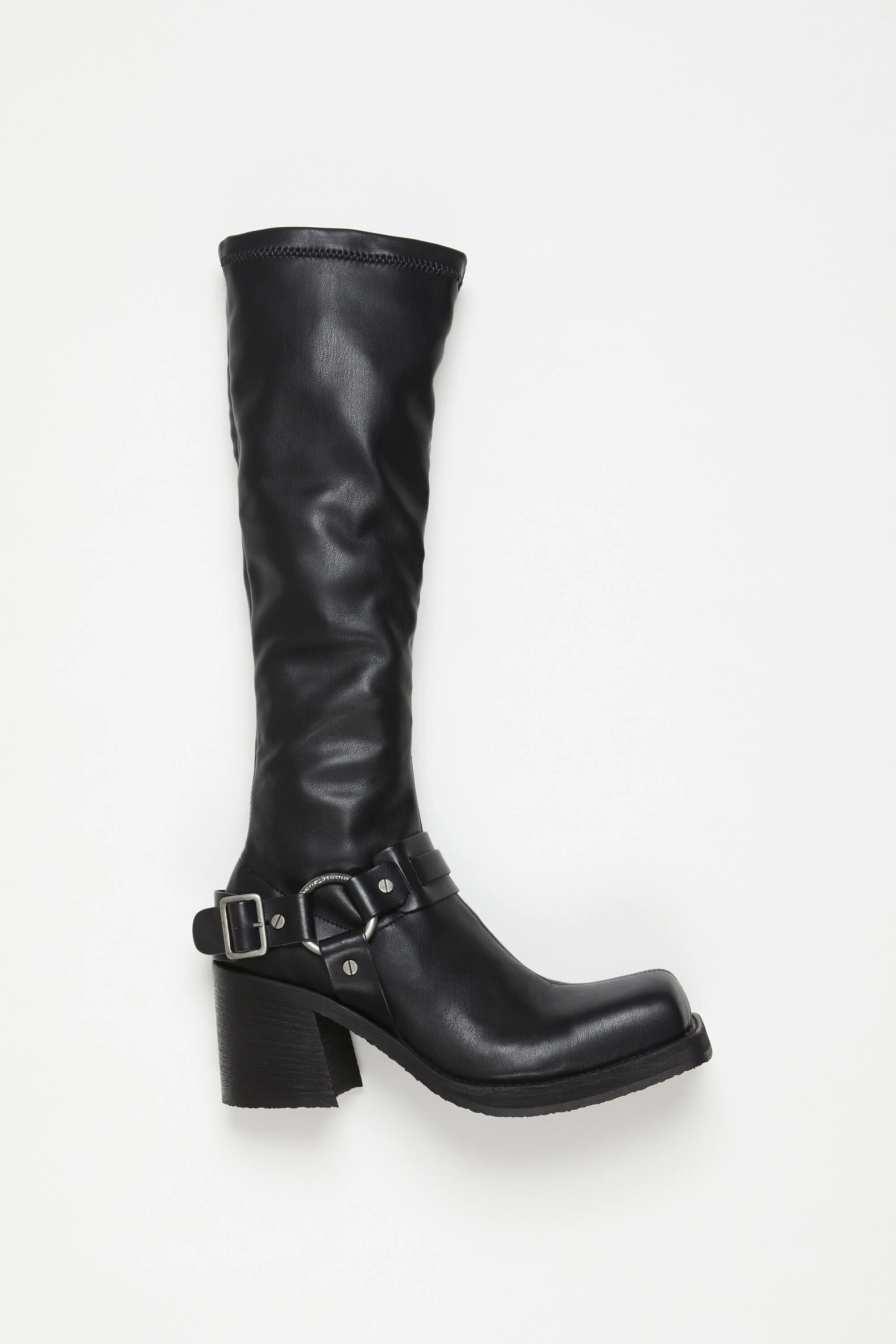 Pull-on tight boots feature biker-inspired buckles and stirrup straps with silver-tone metal studs. Complete with a square toe and chunky block heel. - Pull-on boots - Side zipper closure - Below the knee height - Square toe - Chunky heel - Biker-inspired details - Silver-toned metal buckle and details - Sole measurement: 2 cm - Heel measurement: 8 cm - Style ID: FN-WN-SHOE000888 - Uppers: 50% Polyurethane, 30% Polyester, 20% Calf leather, Lining: 100% Preferred lamb leather, Soles: 100% Rubber
